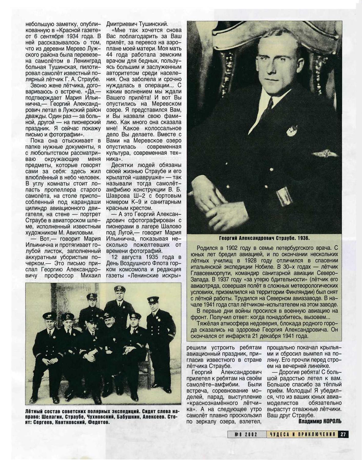 К моему глубочайшему изумлению выяснил, что про Страубе ничего нет в Персоналиях. Более того - в сети одно единственное фото в составе экипажа Красного медведя, времен спасения Нобиле. Даже обстоятельства и дата смерти Георгия Александровича в сети сильно разняться: