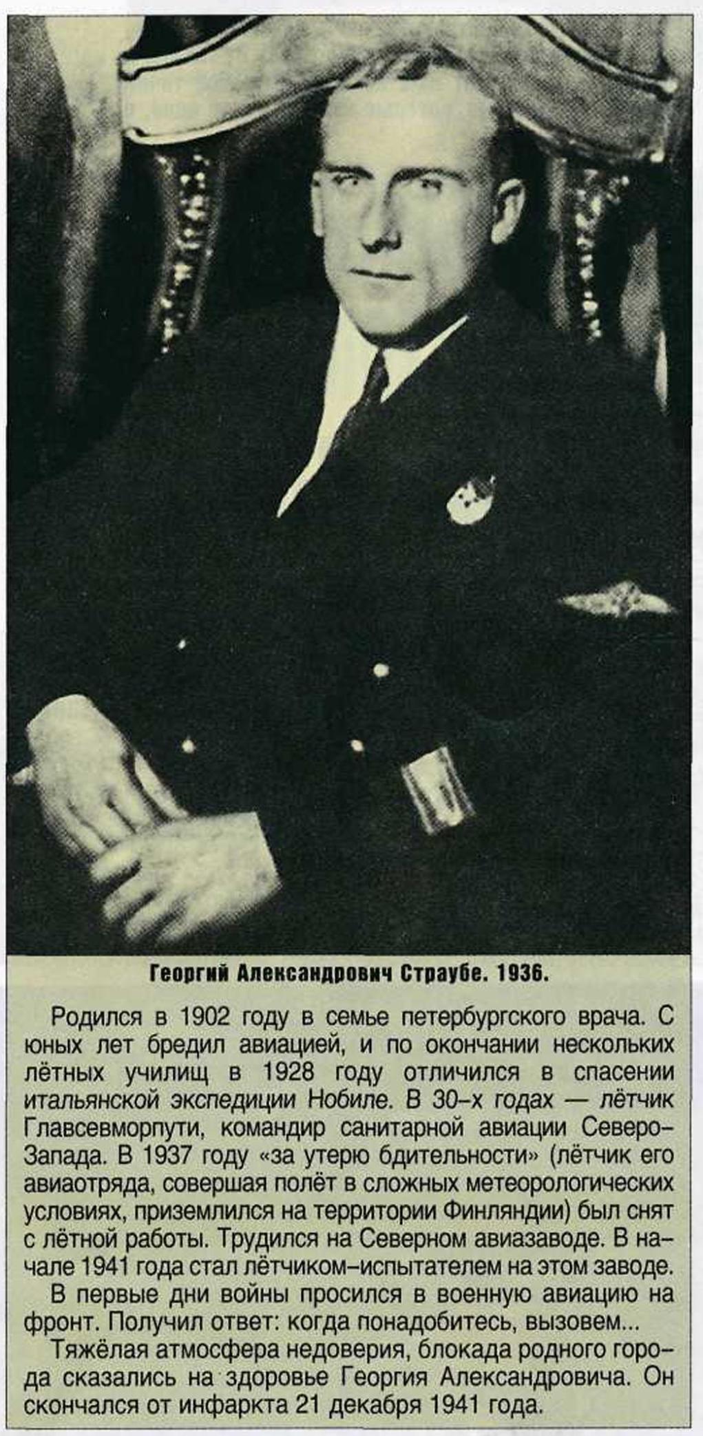 Страубе, Георгий Александрович, родился в Ленинграде в 1902 г. в семье зубного врача. В 1920 г. он окончил единую трудовую школу, бывшее петербургское первое реальное училище, и осенью того же года поступил добровольцем в училище командного состава флота. Окончив в марте 1923 г. училище комсостава флота, тов. Страубе поступил в военную школу летчиков-наблюдателей. Окончив эту школу, он в 1924 г. был назначен на службу в военно-воздушных силах Балтийского моря на должность летчика-наблюдателя. В этой должности он пробыл до октября 1925 г., а затем был назначен в военную школу морских летчиков и окончил ее в январе 1927 г. По окончании школы его командировали на службу в воздушный флот Черного моря, а затем перевели в воздушный флот Балтийского моря на должность младшего летчика в Н-ский авиационный отряд. В апреле 1928 года его назначили старшим летчиком того же отряда, а в начале июня откомандировали на розыски экипажа «Италия».