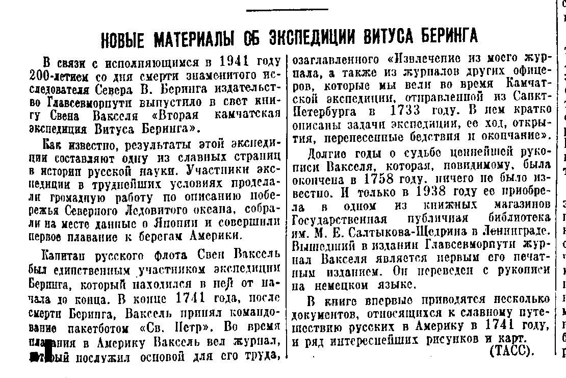 Новые материалы об экспедиции Беринга//Красный флот, 1941,№ 6 (660), 8 января
