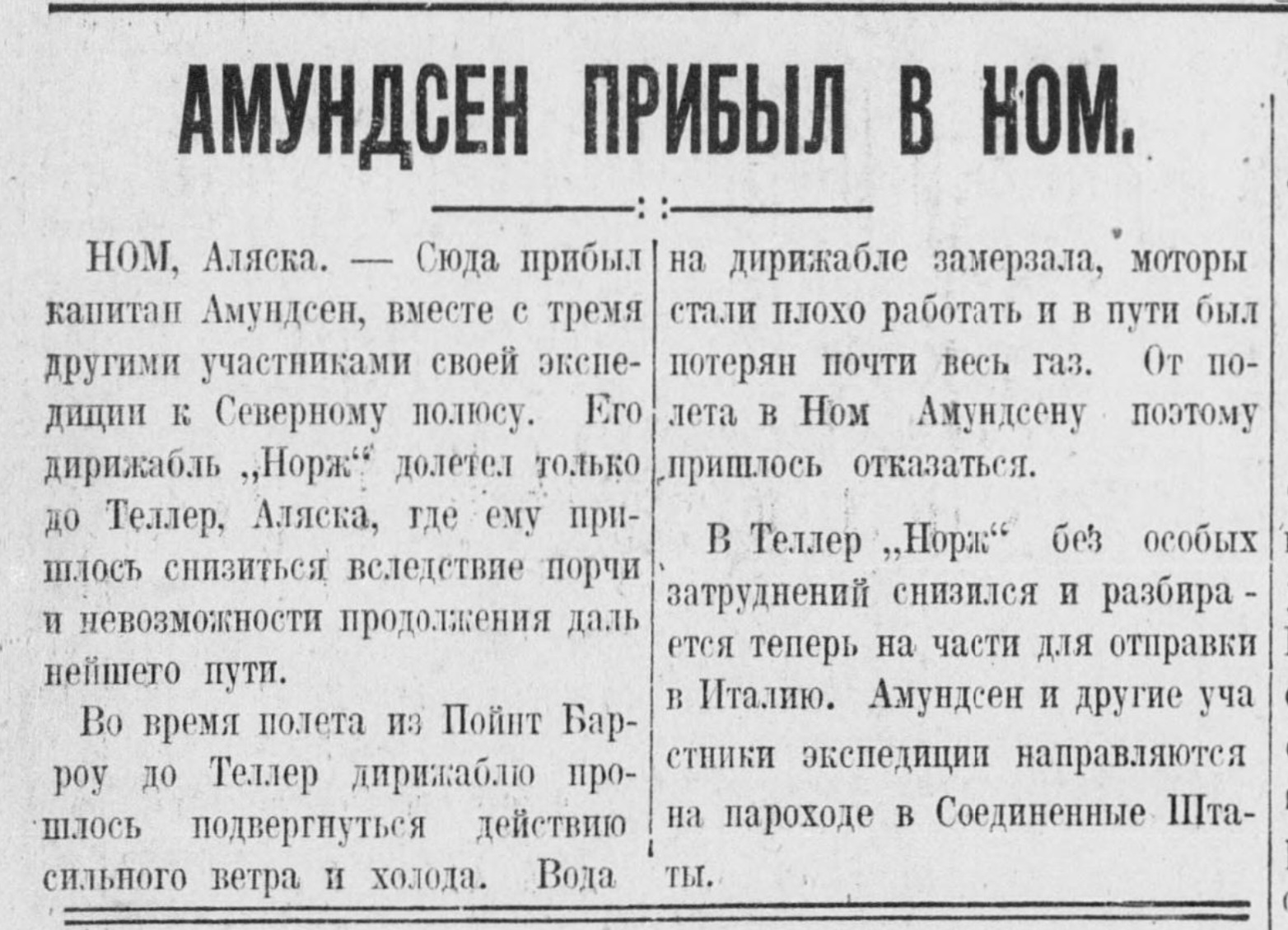 Амундсен прибыл в Ном//Русский вестник 18 мая 1926.