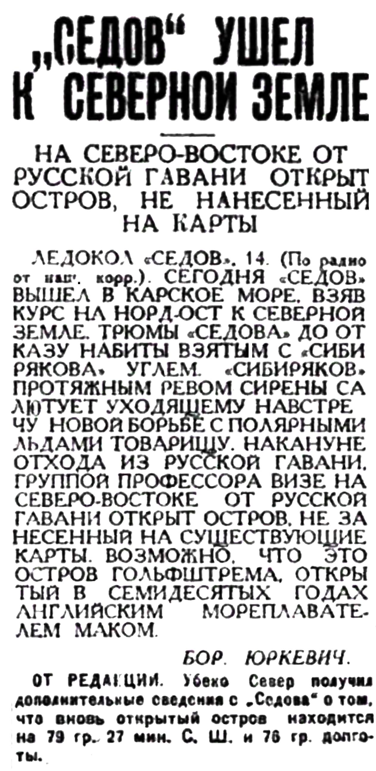 ЛЕДОКОЛ "СЕДОВ". 14. (По радио от наш. корр. ). СЕГОДНЯ "СЕДОВ" ВЫШЕЛ В КАРСКОЕ МОРЕ. ВЗЯВ КУРС НА НОРД-ОСТ К СЕВЕРНОЙ ЗЕМЛЕ. ТРЮМЫ "СЕДОВА" ДО ОТКАЗУ НАБИТЫ ВЗЯТЫМ С "СИБИРЯКОВА" УГЛЕМ. "СИБИРЯКОВ" ПРОТЯЖНЫМ РЕВОМ СИРЕНЫ САЛЮТУЕТ УХОДЯЩЕМУ НАВСТРЕЧУ НОВОЙ БОРЬБЕ С ПОЛЯРНЫМИ ЛЬДАМИ ТОВАРИЩУ. НАКАНУНЕ ОТХОДА ИЗ РУССКОЙ ГАВАНИ. ГРУППОЙ ПРОФЕССОРА ВИЗЕ НА СЕВЕРО-ВОСТОКЕ ОТ РУССКОЙ ГАВАНИ ОТКРЫТ ОСТРОВ. НЕ ЗАНЕСЕННЫЙ НА СУЩЕСТВУЮЩИЕ КАРТЫ ВОЗМОЖНО. ЧТО ЭТО ОСТРОВ ГОЛЬФШТРЕМА, ОТКРЫТЫЙ В СЕМИДЕСЯТЫХ ГОДАХ АНГЛИЙСКИМ МОРЕПЛАВАТЕЛЕМ МАКОМ.