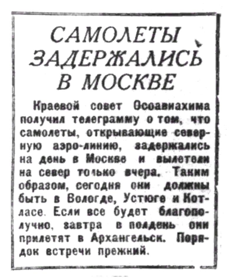 Краевой соавт Осоавиахима получил телеграмму о том, что самолеты, открывающие северную аэро-линию, задержались на день в Москве и вылетели на север только вчера. Таким образом, сегодня они должны быть в Вологде, Устюге и Котласе. Если все будет благополучно, завтра в полдень они прилетят в Архангельск. Порядок встречи прежний.