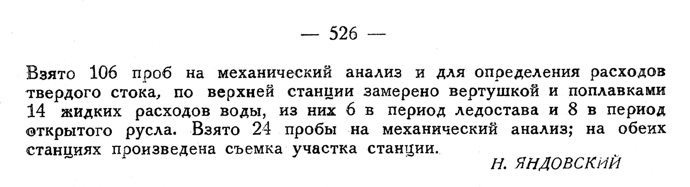 Взято 106 проб на механический анализ и для определения расходов твердого стока, по верхней станции замерено вертушкой и поплавками 14 жидких расходов воды, из них 6 в период ледостава и 8 в период открытого русла. Взято 24 пробы на механический анализ; на обеих станциях произведена съемка участка станции.