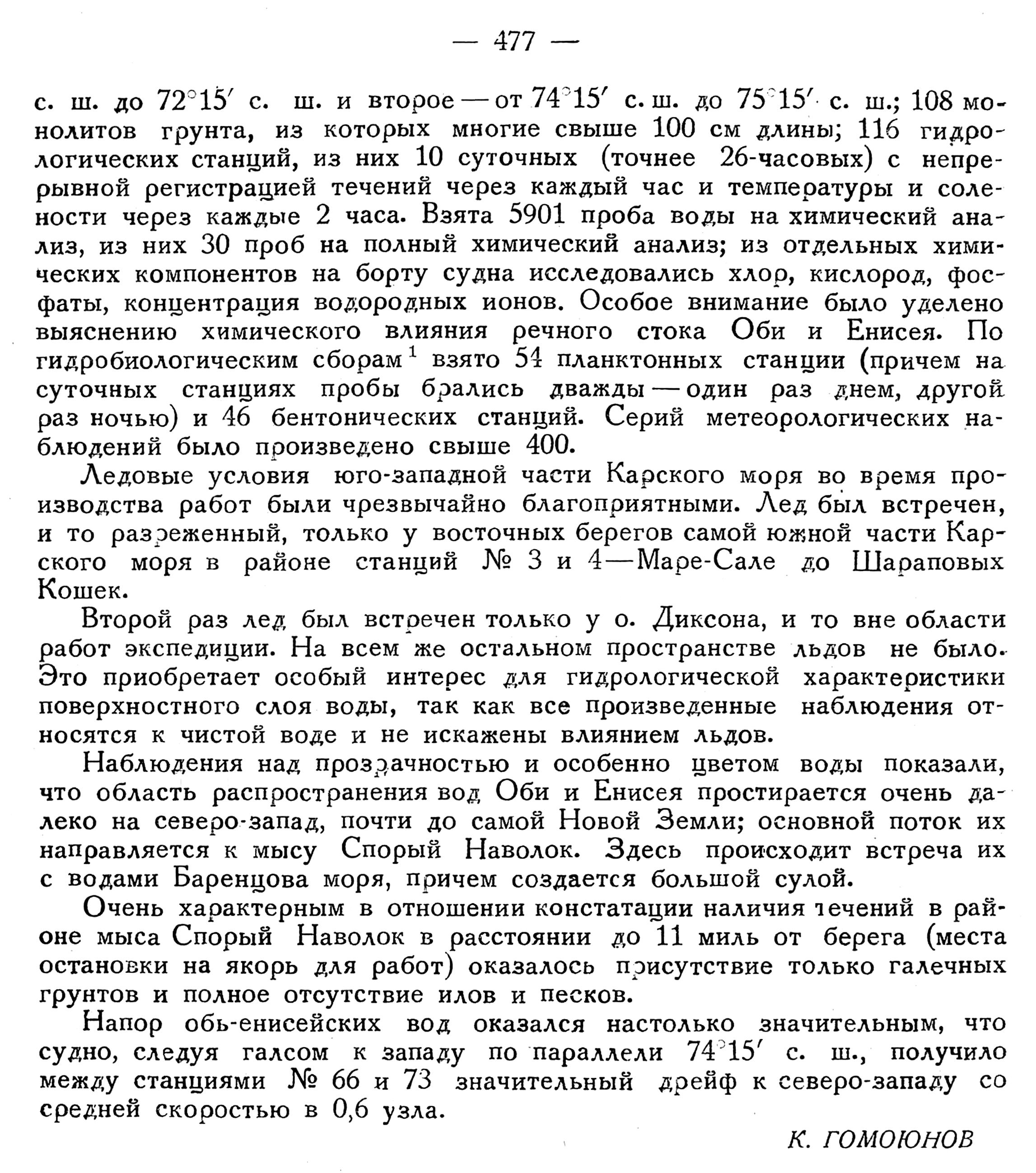 с. ш. до 72°15' с. ш. и второе — от 74°15' с. ш. до 75°15' с. ш.; 108 монолитов грунта, из которых многие свыше 100 см длины; 116 гидрологических станций, из них 10 суточных (точнее 26-часовых) с непрерывной регистрацией течений через каждый час и температуры и солености через каждые 2 часа. Взята 5901 проба воды на химический анализ, из них 30 проб на полный химический анализ; из отдельных химических компонентов на борту судна исследовались хлор, кислород, фосфаты, концентрация водородных ионов. Особое внимание было уделено выяснению химического влияния речного стока Оби и Енисея. По гидробиологическим сборам {1} взято 54 планктонных станции (причем на суточных станциях пробы брались дважды — один раз днем, другой раз ночью) и 46 бентонических станций. Серий метеорологических наблюдений было произведено свыше 400.
