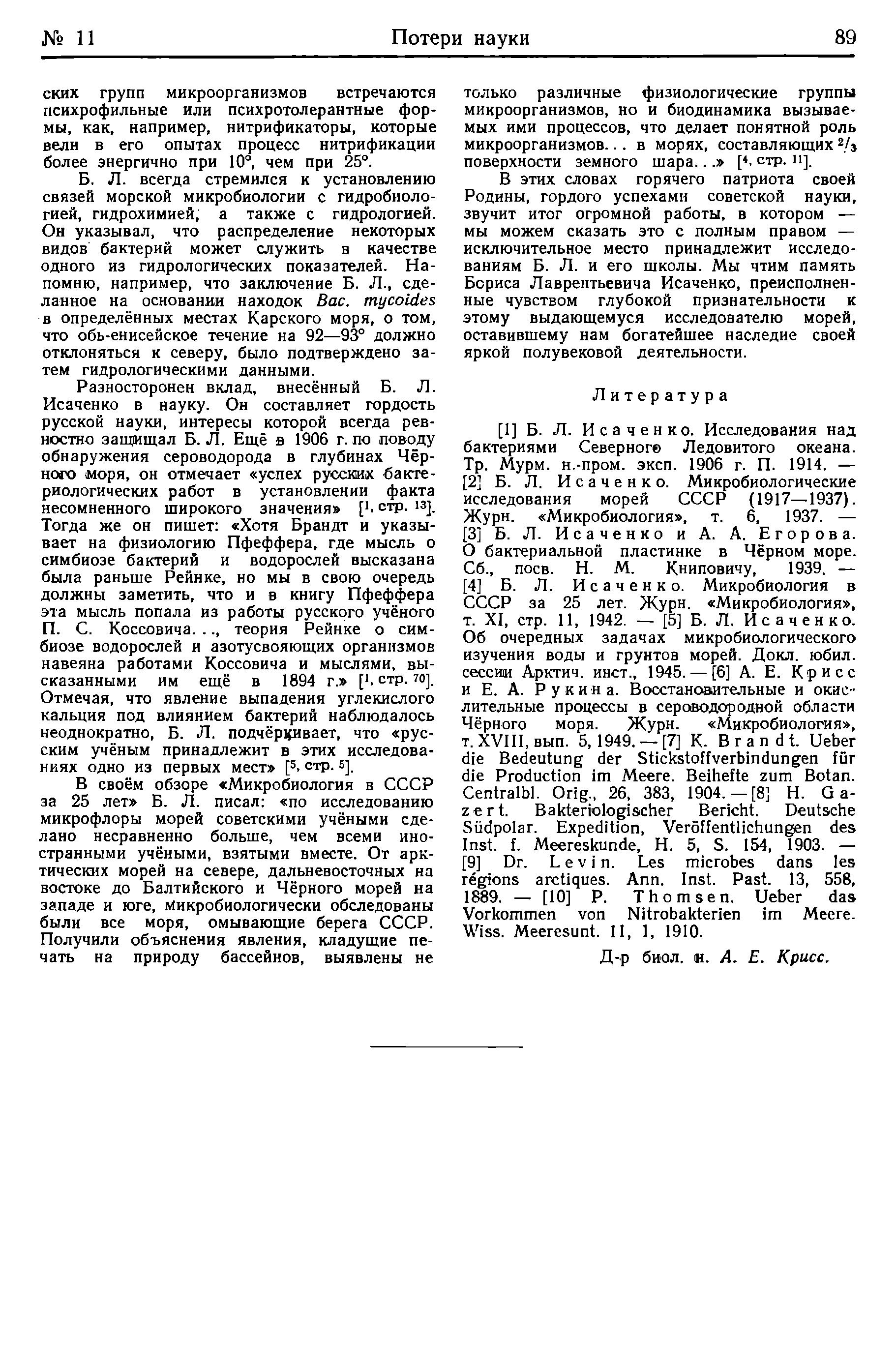 [4] Б. Л. Исаченко. Микробиология в СССР за 25 лет. Журн. «Микробиология», т. XI, стр. 11, 1942. —