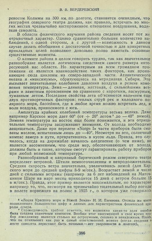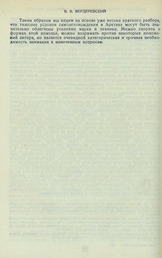 В. В. ВЕРДЕРЕВСКИЙТаким образом мы видим на основе уже весьма краткого разбора, что тяжелые условия самолетовождения в Арктике могут быть значительно облегчены усилиями науки и техники. Можно спорить о формах этой помощи, можно возражать против некоторых положений автора, но является очевидной категорическая и срочная необходимость внимания к намеченным вопросам.