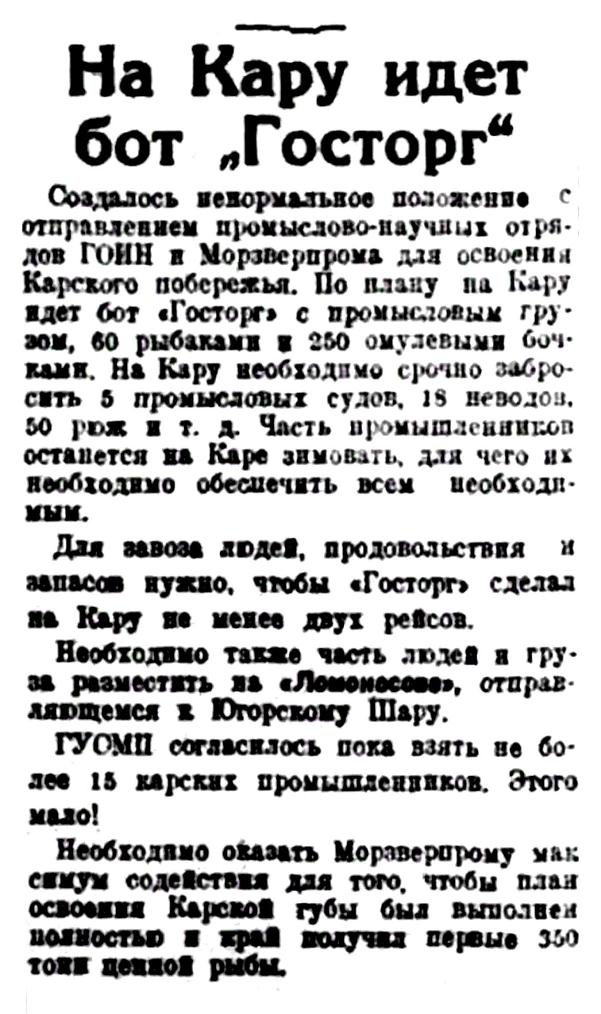 Создалось ненормальное положение с отправлением промыслово-научных отрядов ГОИН и Морзверпрома для освоения Карского побережья. По плану на Кару идет бот "Госторг" с промысловым грузом, 60 рыбаками и 250 омулевыми бочками. На Кару необходимо срочно забросить 9 промысловых судов, 18 неводов, 50 рюж и т. д. Часть промышленников останется на Каре зимовать, для чего их необходимо обеспечить всем необходимым.