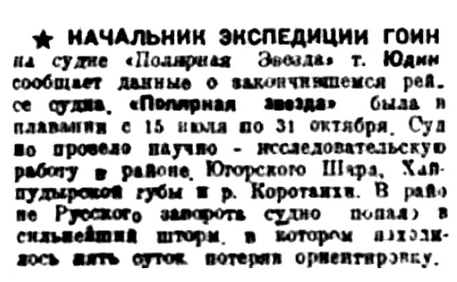 НАЧАЛЬНИК ЭКСПЕДИЦИИ ГОИН НА судне "Полярная Звезда" т. Юдин сообщает данные о закончившемся рейсе судна. "Полярная Звезда" была в плавании с 15 июля по 31 октября. Судно провело научно-исследовательскую работу в районе Югорского Шара, Хайпудырской губы и р. Коротаихи. В районе Русского заворота судно попало в сильнейший шторм, в котором находилось пять суток потеряв ориентировку.
