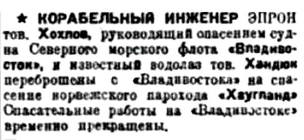 В мае 1933 года партия ЭПРОН'а по спасении парохода " Владивосток" приступила к работе. Сейчас занято на работах более 100 человек. Техническими силами и рабочей силой экспедиция обеспечена. И уже после трехдекадной работы экспедиции, результаты сказалось.