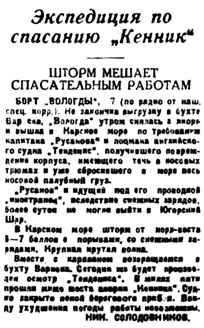 БОРТ "ВОЛОГДЫ", 7 (по радио от наш. спец. корр.). Не закончив выгрузку в бухте Варнека, "Вологда" утром снялась с якоря и вышла в Карское море по требованию капитана "Русанова" и лоцмана английского судна "Тенденис", получившего повреждение корпуса, имеющего течь в носовых трюмах и уже сбросившего в море весь носовой палубный груз.