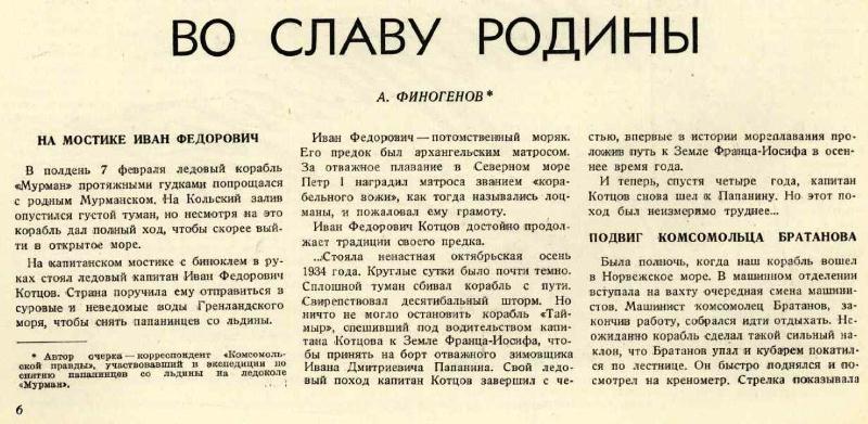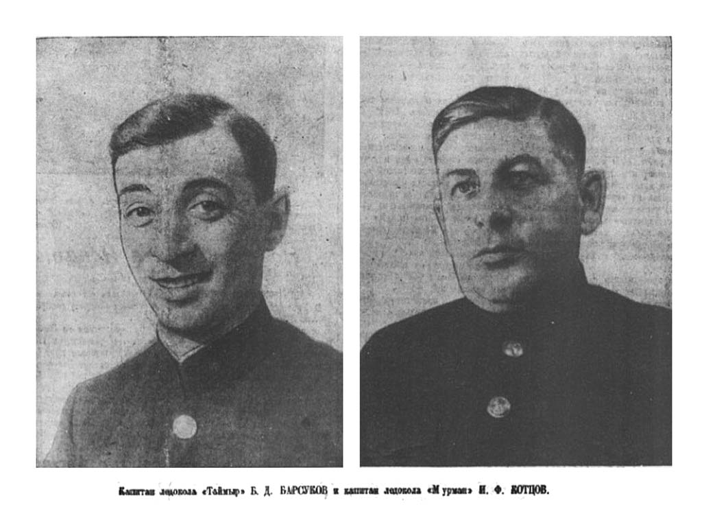Капитан ледокола «Мурман» Иван Федорович Котцов родился в 1895 г. Отец его и дед были морскими лоцманами в Архангельске. Сам он начал плавал, матросом с 18 лет. В 1918 году окончил мореходное училище в Архангельске. С 1919 г. он непрерывно плавает на гидрографических судах Севера — сперва помощником командира, а с 1925 г. — командиром. С 1933 г. до 1937 г. т. Котцов — командир ледокола «Таймыр». Под его командованием судно совершило ряд больших арктическим походов в Карском, Баренцовом и Гренландском морях. Поздней осенью 1933 г. он на «Таймыре» сиял И. Д. Папанина с зимовки на Земле Франца-Иосифа. В январе 1936 г. «Таймыр» впервые в это время года посетил Баренцбург на Шпицбергене, чем практически доказал возможность зимней навигации в этом районе. С середины 1937 г. тов. Котцов командует ледоколом «Мурман».
