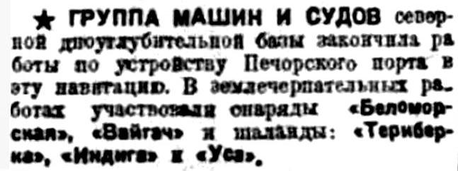 ГРУППА МАШИН И СУДОВ северной дноуглубительной базы закончила работы по устройству Печорского порта в эту навигацию. В землечерпательных работах участвовали снаряды «Беломорская», «Вайгач» и шаланды: «Териберка», «Индига» и «Уса».