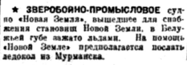 * ЗВЕРОБОЙНО-ПРОМЫСЛОВОЕ судно "Новая Земля", вышедшее для снабжения становищ Новой Земли, в Белушьей губе зажато льдами. На помощь "Новой Земле" предполагается послать ледокол из Мурманска.