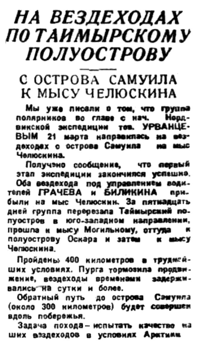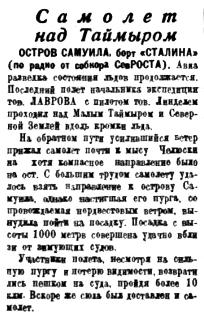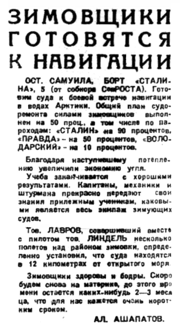 «Красин» возвращается в Ленинград из шестого полярного рейса. Этот поход выполнен с таким же успехом, как и все предыдущие. Красинцы заверяют партию и правительство, что и в дальнейшей работе по завоеванию Арктики они неизменно будут на передовых постах.
