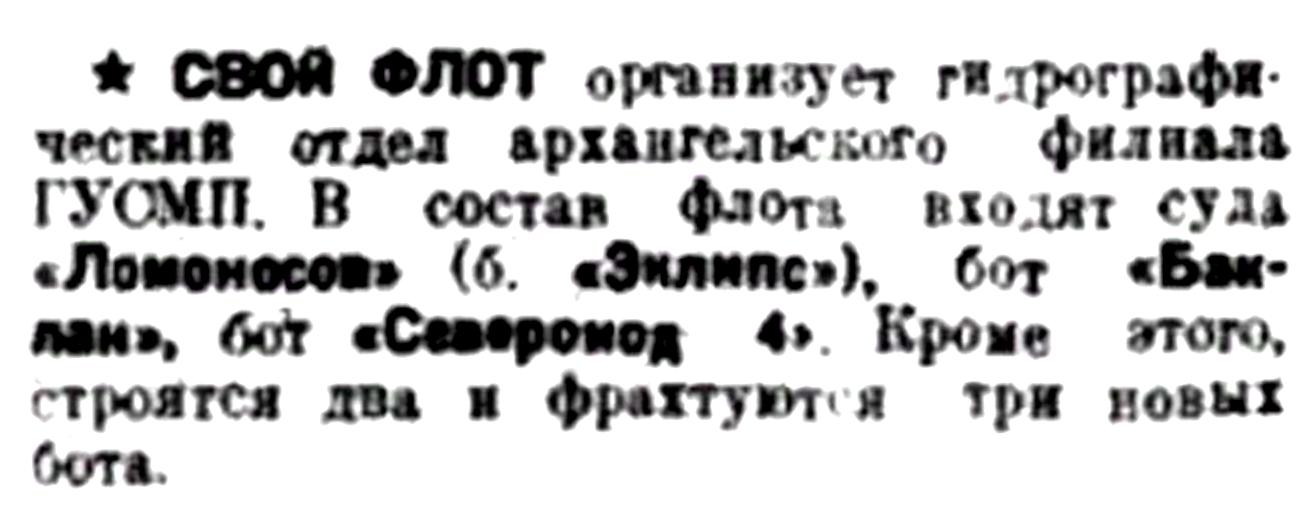 * СВОЙ ФЛОТ организует гидрографический отдел архангельского филиала ГУСМП. В состав флота входят суда "Ломоносов" (б. "Эклипс"), бот "Баклан", бот "Североиод-4". Кроме этого, строятся два и фрахтуются три новых бота.