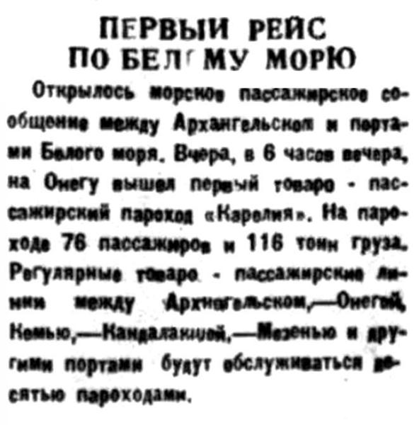 Открылось морское пассажирское сообщение между Архангельском и портами Белого моря. Вчера, в 6 часов вечера, на Онегу вышел первой товаро-пассажирский пароход "Карелия". На пароходе 76 пассажиров и 116 тонн груза. Регулярные товаро-пассажирские линии между Архангельском, — Онегой, Кемью, — Кандалакшей, — Мезенью и другими портами будут обслуживаться десятью пароходами.