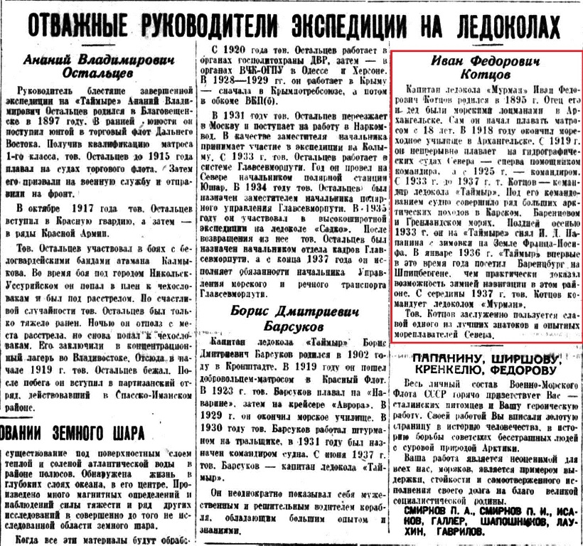 Капитан ледокола «Мурман» Иван Федорович Котцов родился в 1895 г. Отец его и дед были морскими лоцманами в Архангельске. Сам он начал плавал, матросом с 18 лет. В 1918 году окончил мореходное училище в Архангельске. С 1919 г. он непрерывно плавает на гидрографических судах Севера — сперва помощником командира, а с 1925 г. — командиром. С 1933 г. до 1937 г. т. Котцов — командир ледокола «Таймыр». Под его командованием судно совершило ряд больших арктическим походов в Карском, Баренцовом и Гренландском морях. Поздней осенью 1933 г. он на «Таймыре» сиял И. Д. Папанина с зимовки на Земле Франца-Иосифа. В январе 1936 г. «Таймыр» впервые в это время года посетил Баренцбург на Шпицбергене, чем практически доказал возможность зимней навигации в этом районе. С середины 1937 г. тов. Котцов командует ледоколом «Мурман».