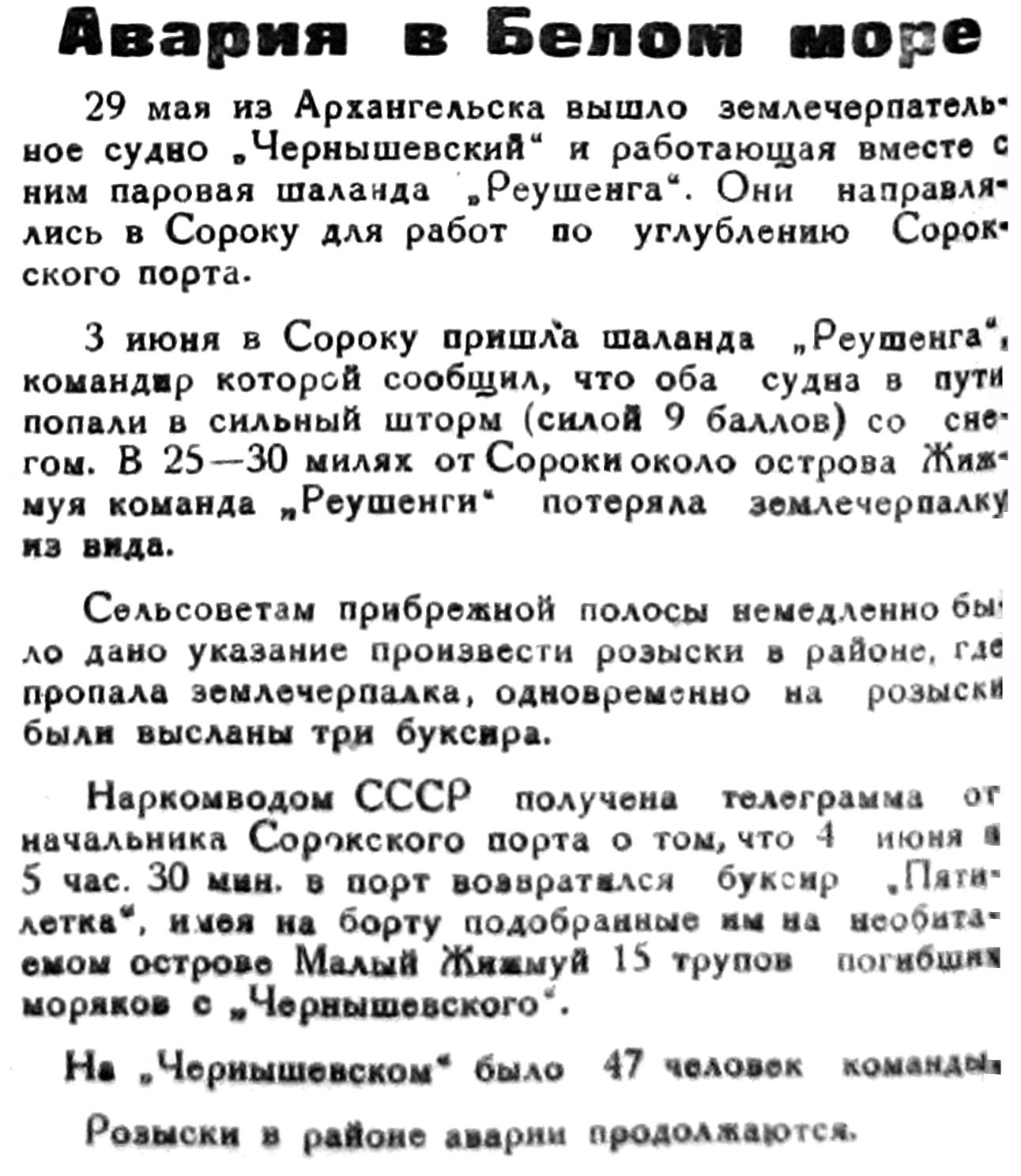 9 июня 1935 года бассейновая газета «Моряк Севера» вышла с траурным сообщением о гибели земснаряда «Чернышевский». Сообщалось, что земснаряд 29 мая вышел на работу в порт Сорока (теперь Беломорск) с командой 52 человека. Вместе с ним вышла и паровая шаланда «Реушеньга». Из-за сильного северо-восточного ветра суда до 31 мая стояли на якоре у Черной башни острова Мудьюг. 31 мая в 14.00 караван снялся в море и отправился в Сороку. Однако 1 и 2 июня в Белом море разыгрался сильнейший шторм с ураганными порывами ветра.