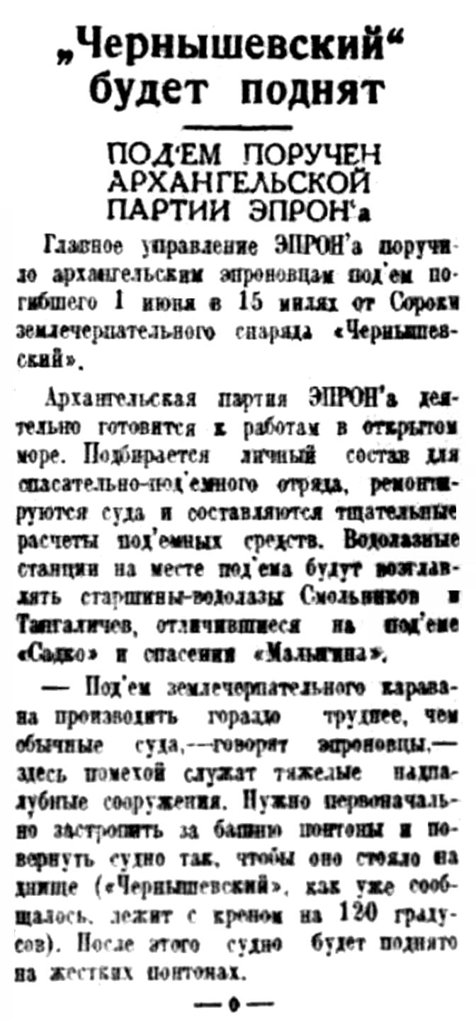 Ночью 28 июня, как сообщает СевТАСС, из Архангельска отплыл отряд ЭПРОН’а, которому поручен подъем погибшего в Белом море землечерпательного снаряда "Чернышевский". В составе экспедиции — спасательное судно "Совнарком" и новая пловучая водолазная база ЭПРОН'а "Соловки". Подъемом будет руководить бывший начальник Балтийской партии ЭПРОН, инспектор главного управления тов. Загвоздкин. Известный водолазный специалист Симонов является консультантом подъемных работ.