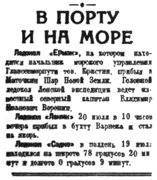 "Ермак" провел ледовую разведку у острова Белого, первым пройдя в Карское море. Эта разведка и два полета летчика Алексеева показали, что карские льды позволяют проводку судов за мощным ледоколом. "Ермак" продолжает разведку к востоку. Температура воздуха — 11 градусов ниже нуля.