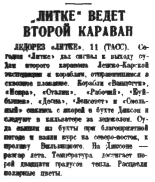 ЛЕДОРЕЗ "ЛИТКЕ", 11 (ТАСС). Сегодня "Литке" дал сигнал к выходу судам второго каравана Ленско-Карской экспедиции и кораблям, отправившимися в сквозное плавание. Корабли "Ванцетти", "Искра", "Сталин", "Рабочий", "Куйбышев", "Десна", "Ленсовет" и "Смольный" снялись с якорей в бухте Диксон и следуют в кильватере за ледоколом. Суда вышли из бухты при благоприятной погоде и взяли курс на северо-восток, к проливу Вилькицкого. На Диксоне — разгар лета. Температура достигает порой двадцати градусов тепла. Расцвели полярные цветы.
