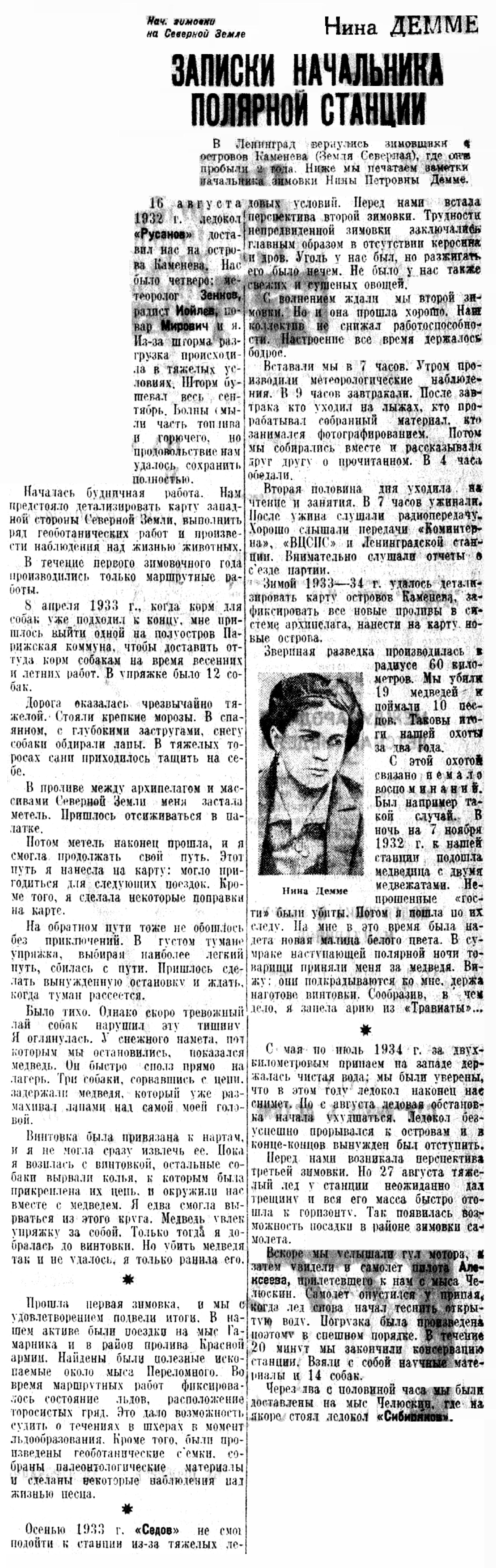 В Ленинград вернулись зимовщики с островов Каменева (Земля Северная), где они пробыли 2 года. Ниже мы печатаем заметки начальника зимовки Нины Петровны Демме.