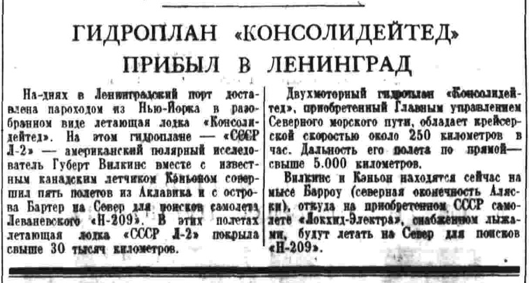На днях в Ленинградский порт доставлена пароходом из Нью-Йорка в разобранном виде летающая лодка «Консолидейтед». На этом гидроплане — «СССР Л-2» — американский полярный исследователь Губерт Вилкинс вместе с известным канадским летчиком Кэньоном совершил пять полетов из Аклавика и с острова Бартер на Север для поисков самолета Леваневского «Н-209». В этих полетах летающая лодка «СССР Л-2» покрыла выше 30 тысяч километров.