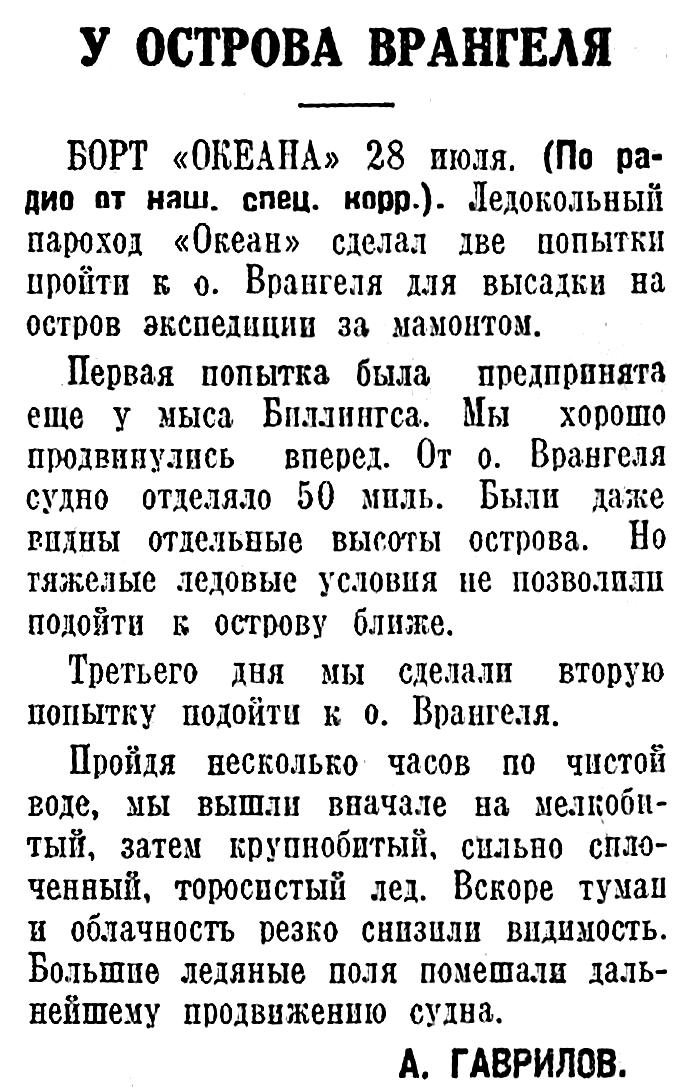 По радио от наш. спец. корр.). Ледокольный пароход «Океан» сделал две попытки пройти к о. Врангеля для высадки на остров экспедиции за мамонтом.