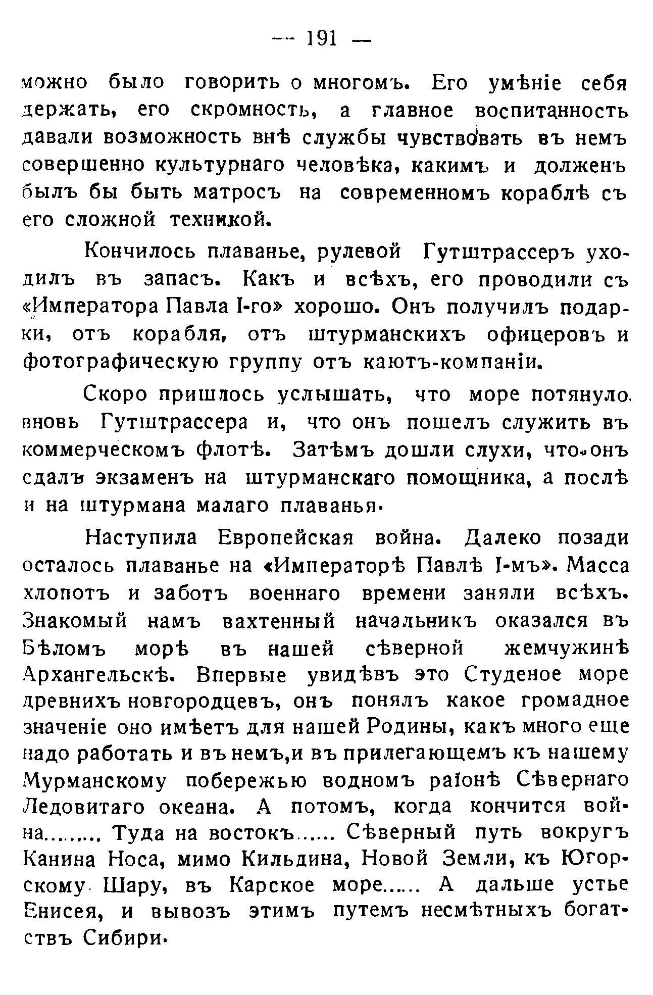 Наступила Европейская война. Далеко позади осталось плаванье на "Императорѣ Павлѣ 1-мъ". Масса хлопотъ и заботъ военнаго времени заняли всѣхъ. Знакомый намъ вахтенный начальникъ оказался въ Бѣломъ морѣ въ нашей сѣверной жемчужинѣ Архангельскѣ. Впервые увидѣвъ это Студеное море древнихъ новгородцевъ, онъ понялъ какое громадное значеніе оно имѣетъ для нашей Родины, какъ много еще надо работать и въ немъ, и въ прилегающемъ къ нашему Мурманскому побережью водномъ раіонѣ Сѣвернаго Ледовитаго океана. А потомъ, когда кончится война.... Туда на востокъ... Сѣверный путь вокругъ Канина Носа, мимо Кильдина, Новой Земли, къ Югорскому Шару, въ Карское море... А дальше устье Енисея, и вывозъ этимъ путемъ несмѣтныхъ богатствъ Сибири.