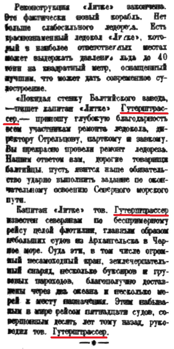 Капитан "Литке" тов. Гутерштрассер известен северянам по беспримерному рейсу целой флотилии, главным образом небольших судов из Архангельска в Черное море. Суда эти, в том числе огромный несамоходный кран, землечерпательный снаряд, несколько буксиров и грузовых пароходов, благополучно доставлены через два океана и несколько морей к месту назначения. Этим незабываемым в мире рейсом пятнадцати судов, совершенным десять лет тому назад, руководил тов. Гутерштрассер.