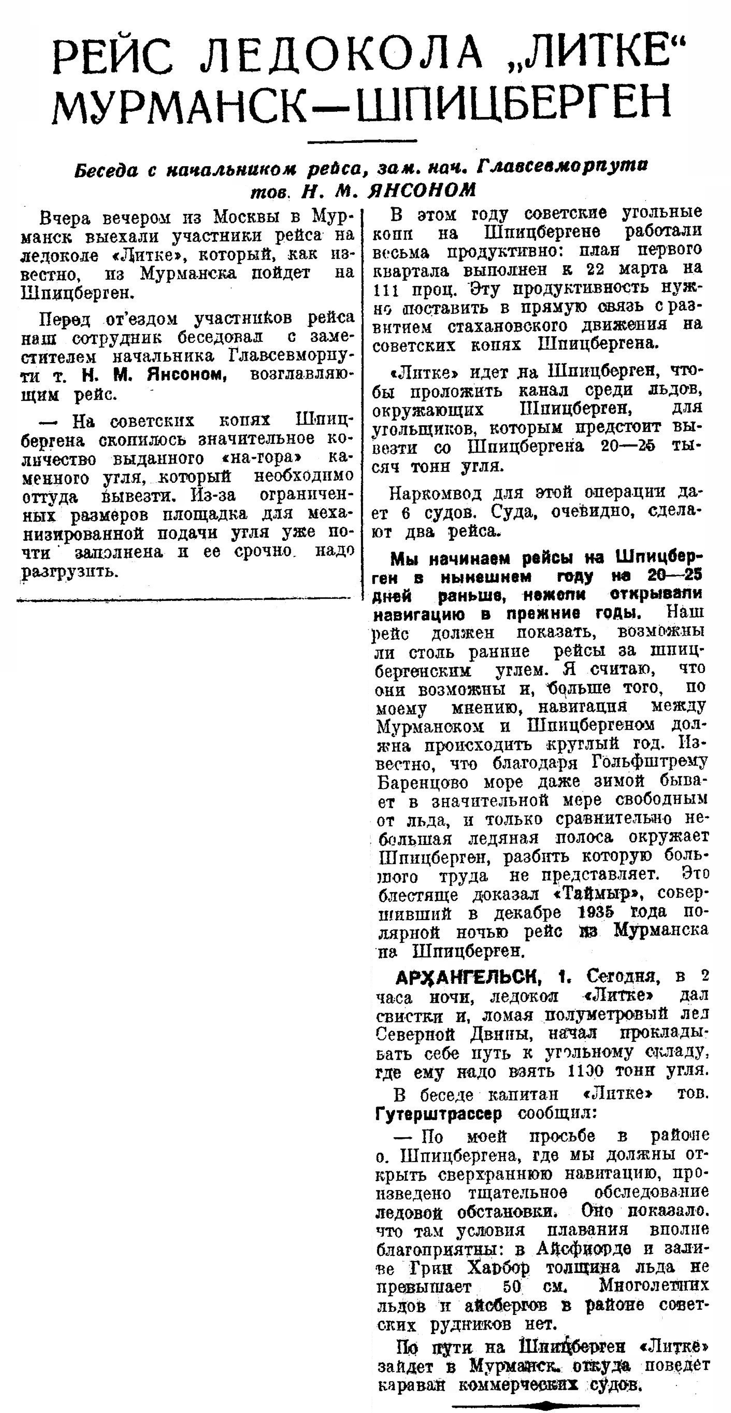Вечером, 11 апреля ледокол «Литке» покинул Мурманский порт, взяв курс на остров Шпицберген. В случае благоприятного состояния льдов, вслед за «Литке» (по его вызову) выйдут семь советских пароходов. Они возвратятся с полним грузом угля, добытого на советских рудниках Шпицбергена.