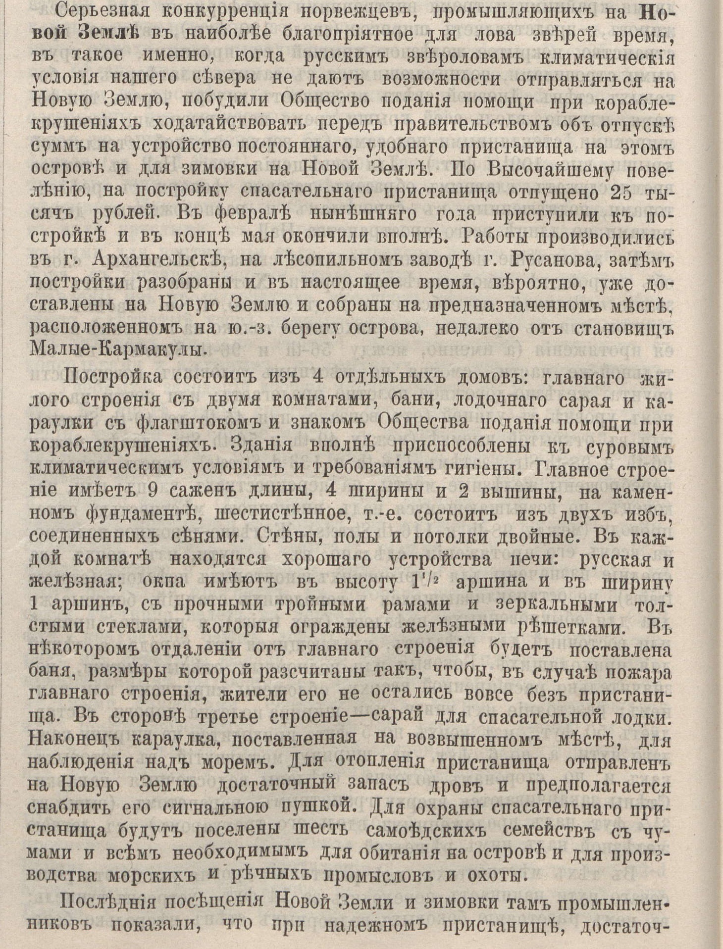 С грустнымъ чувствомъ я вышелъ из домика, желая осмотрѣть его и снаружи, чтобы обратить особое вниманіе на восточную и сѣверо-восточную его наружныя стѣны : нѣт ли здѣсь вліянія суровыхъ зимнихъ вѣтров? Но такого вліянія не оказалось. Маточкинъ Шаръ защищенъ с востока горами, и постройки его от вліянія страшнаго восточнаго вѣтра, называемаго здѣсь «стокъ», защищены. Направленіе окон и фасады всѣх домовъ этой колоніи, — включая и домикъ Носилова, — выходятъ, по моимъ провѣркамъ, на С.-В.