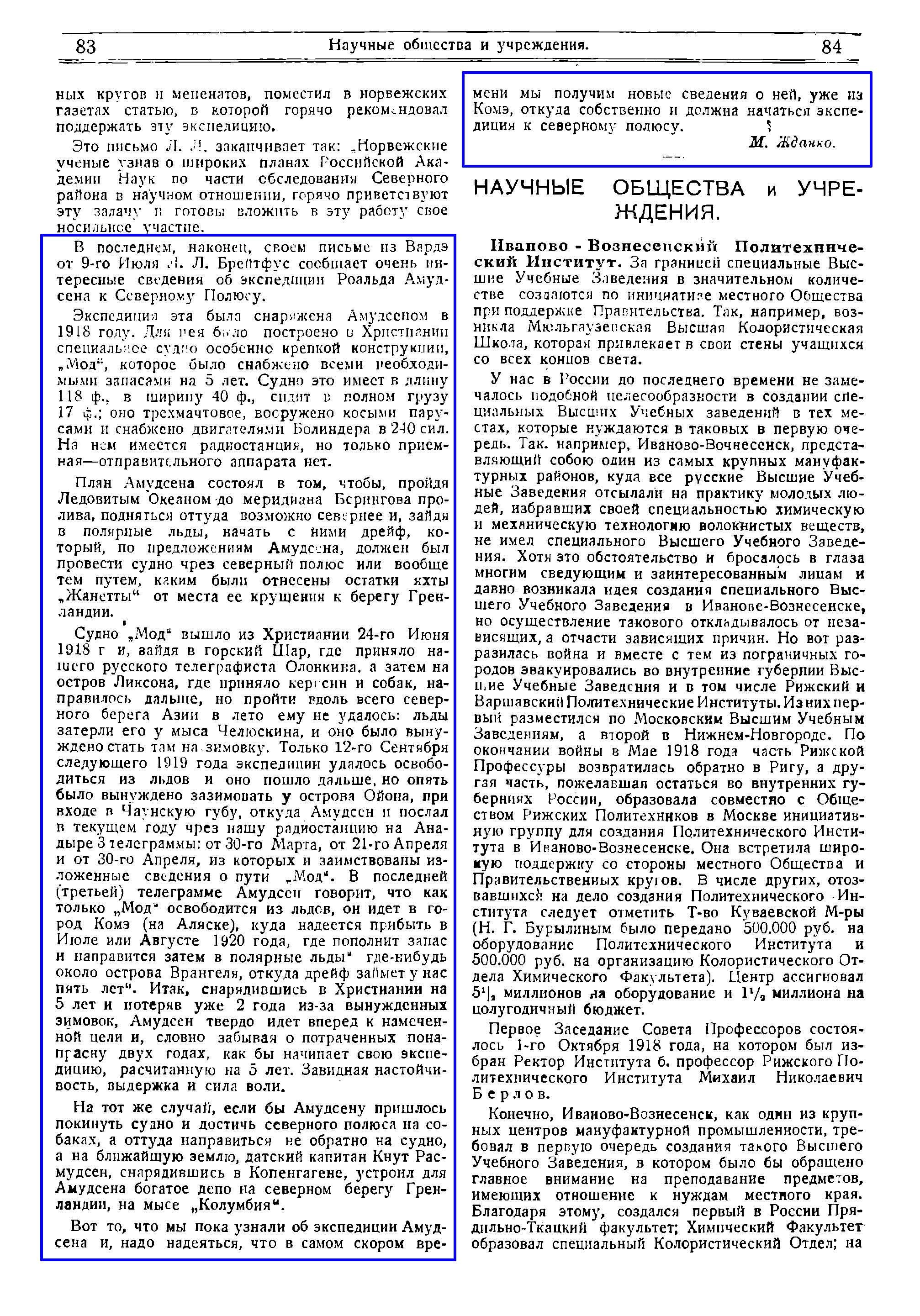 Известный полярный исследователь Р. Амундсен подготовляет новую арктическую экспедицию, которая выходить в марте или aпреле. Для экспедиции строится новое судно, удовлетворяющее современным техническим требованиям. Амундсен предполагает взять с собою аэроплан для разведок в полярных областях.