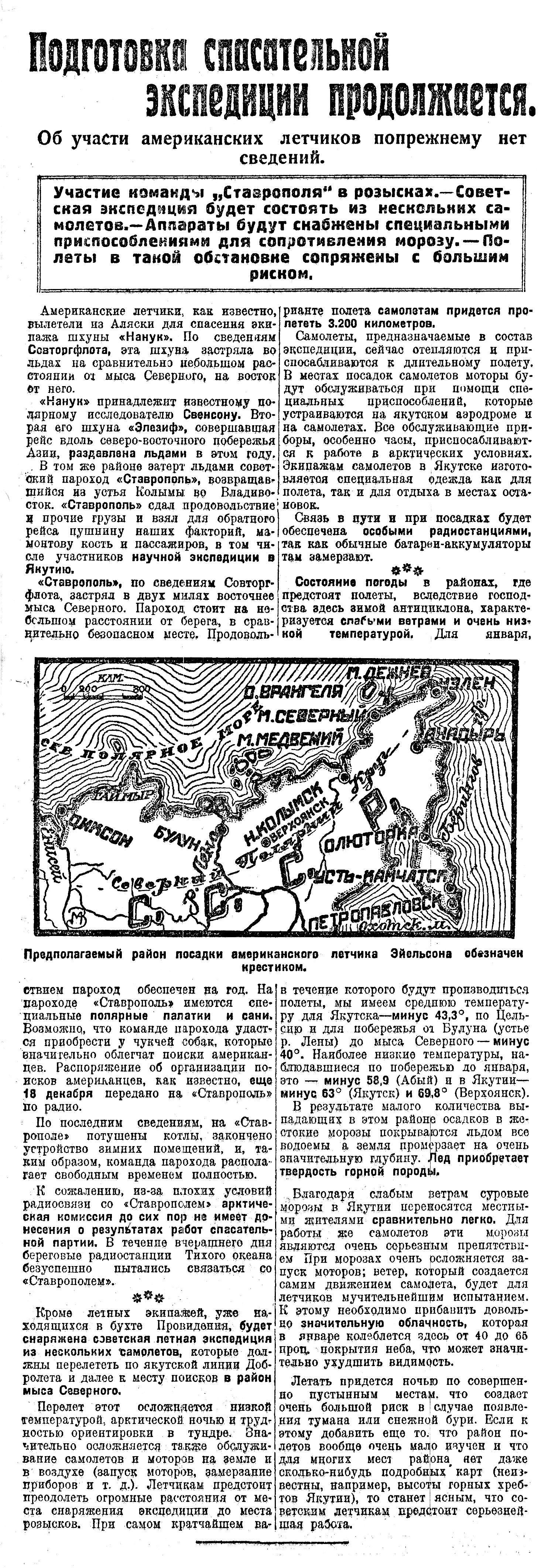 Кроме летных экипажей, уже находящихся в бухте Провидения, будет снаряжена советская летная экспедиция из нескольких самолетов, которые должны перелететь по якутской линии Добролета и далее к месту поисков в район мыса Северного.