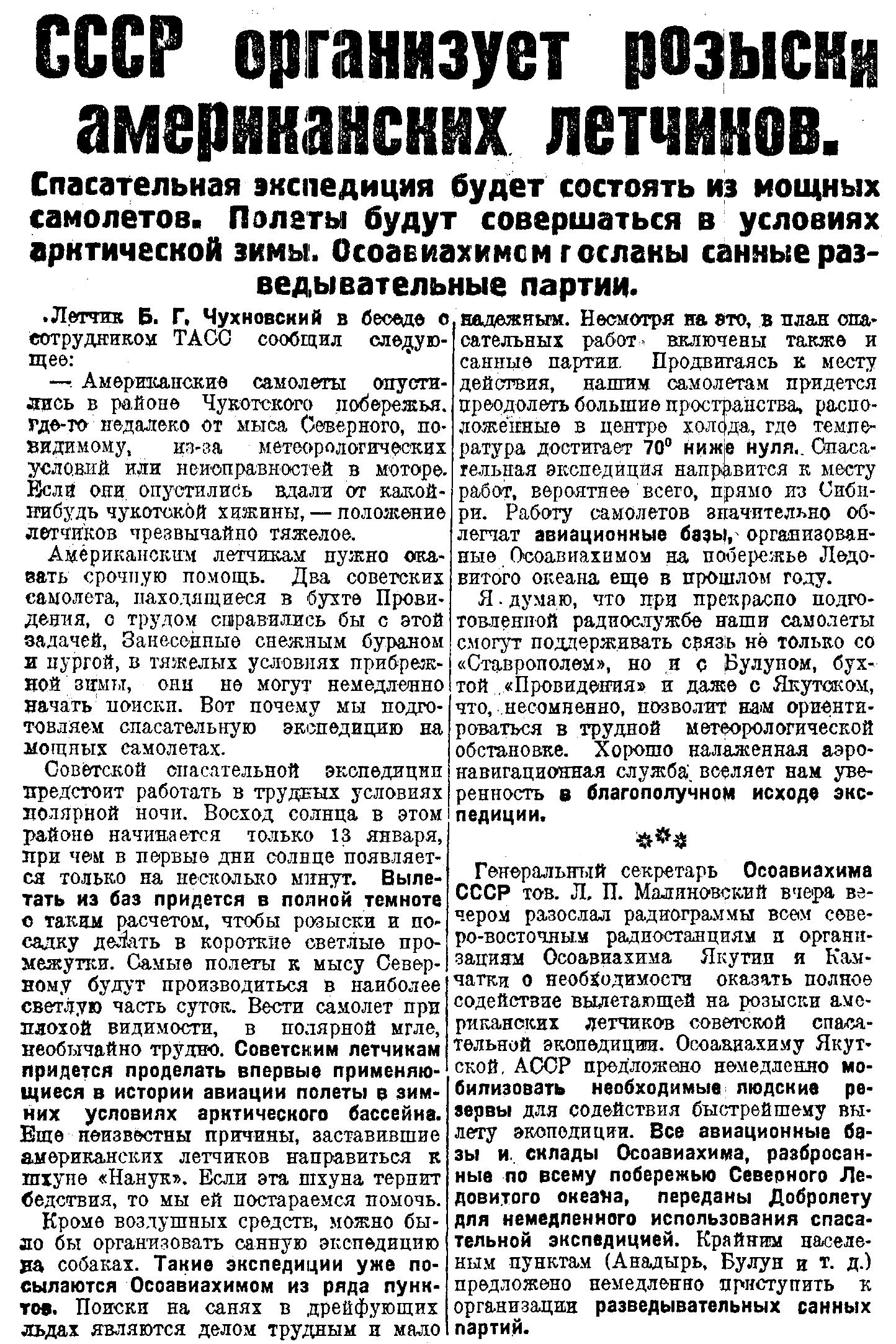 Генеральный секретарь Осоавиахима СССР тов. Л. П. Малиновский вчера вечером разослал радиограммы всем северо-восточным радиостанциям и организациям Осоавиахима Якутии и Камчатки о необходимости оказать полное содействие вылетающей на розыски американских летчиков советской спасательной экспедиции. Осоавиахиму Якутской. АССР предложено немедленно мобилизовать необходимые людские резервы для содействия быстрейшему вылету экспедиции. Все авиационные базы и склады Осоавиахима, разбросанные по всему побережью Северного Ледовитого океана, переданы Добролету для немедленного использования спасательной экспедицией. Крайним населенным пунктам (Анадырь, Булун и т. д. ) предложено немедленно приступить к организации разведывательных санных партий.
