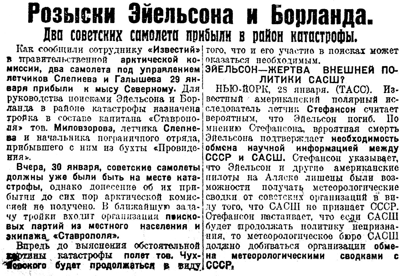 Как сообщили сотруднику «Известий» в правительственной арктической комиссии, два самолета под управлением летчиков Слепнева и Галышева 29 января прибыли к мысу Северному. Для руководства поисками Эйельсона и Борланда в районе катастрофы назначена тройка в составе капитана «Ставрополя» тов. Миловзорова, летчика Слепнева и начальника пограничного отряда, прибывшего с ним из бухты «Провидения».