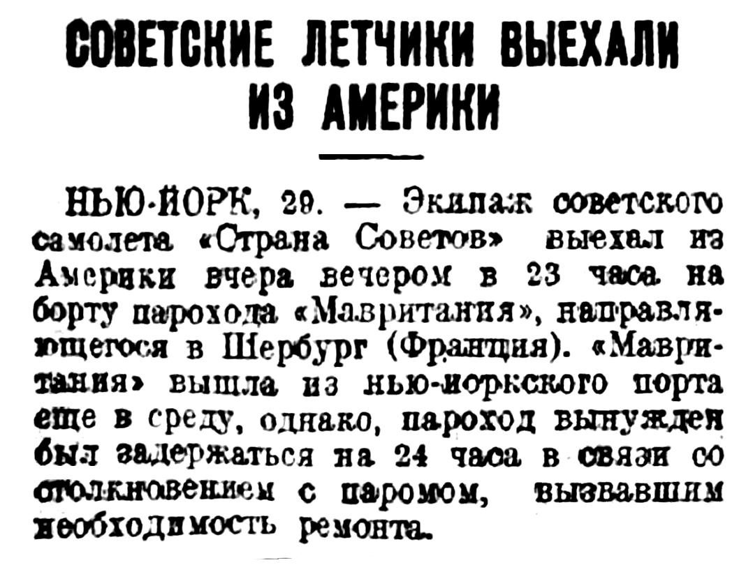 И пусть — третьего дня «люди-птицы» прибыли на Советскую землю поездом, а самолет придет к нам морем, — недалек тот час, когда советское знамя будет реять над самолетом, который сделал перелет Москва — Нью-Йорк — Москва.