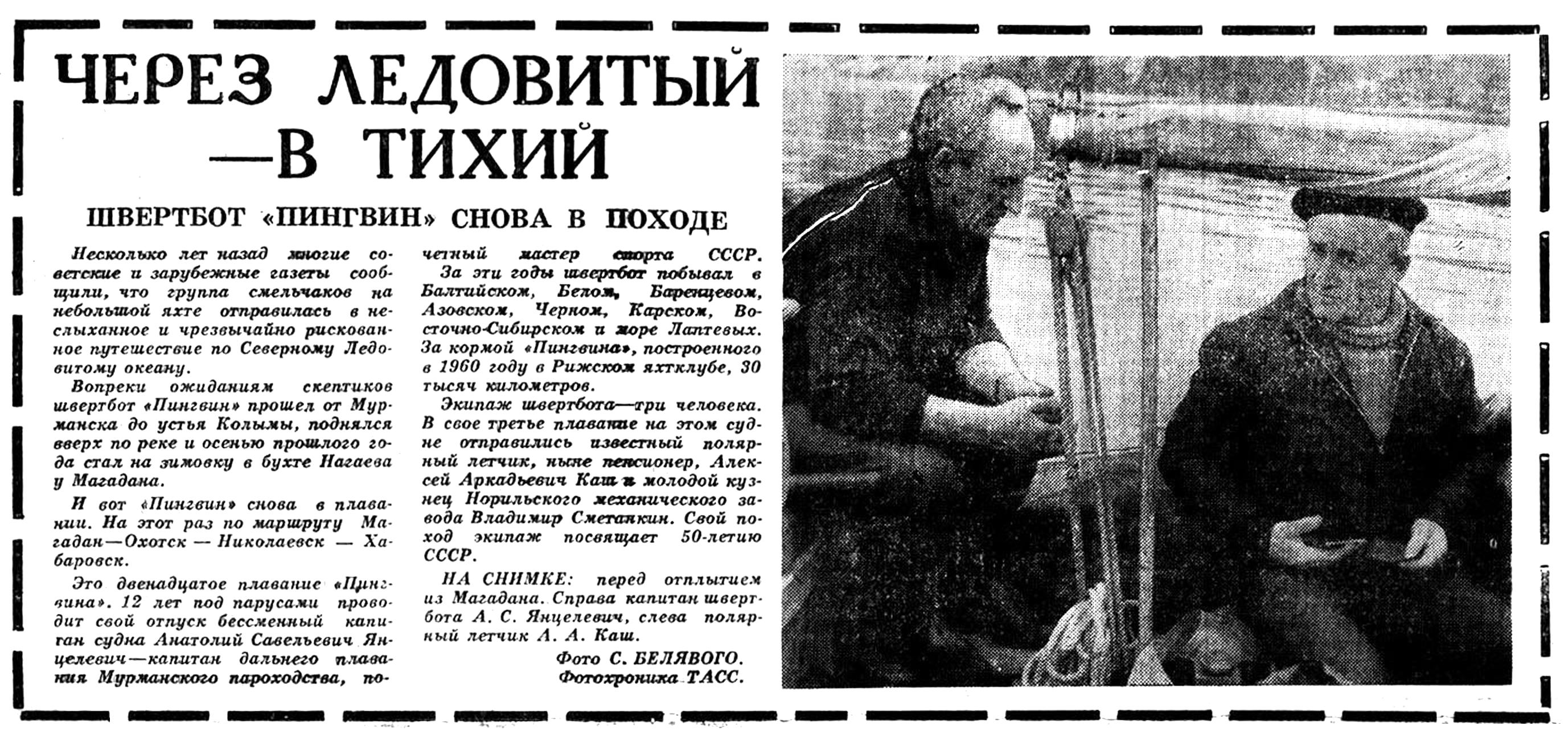 Кто шел на «Пингвине»? Капитан дальнего плавания Янцелевич и полярный летчик - «миллионер» Каш. Цель арктического рейса — пройти путем поморов и доказать, что парусный спорт может развиваться не только в теплых морях, — была достигнута. Однако стоянка «Пингвина» в Норильске продлилась лишь одну зиму: на следующий год он снова поднял паруса и отправился дальше на север и на восток — до устья Лены, в Тикси. Место Алексея Каша в экипаже яхты занял норильский кузнец Владимир Сметанкин.