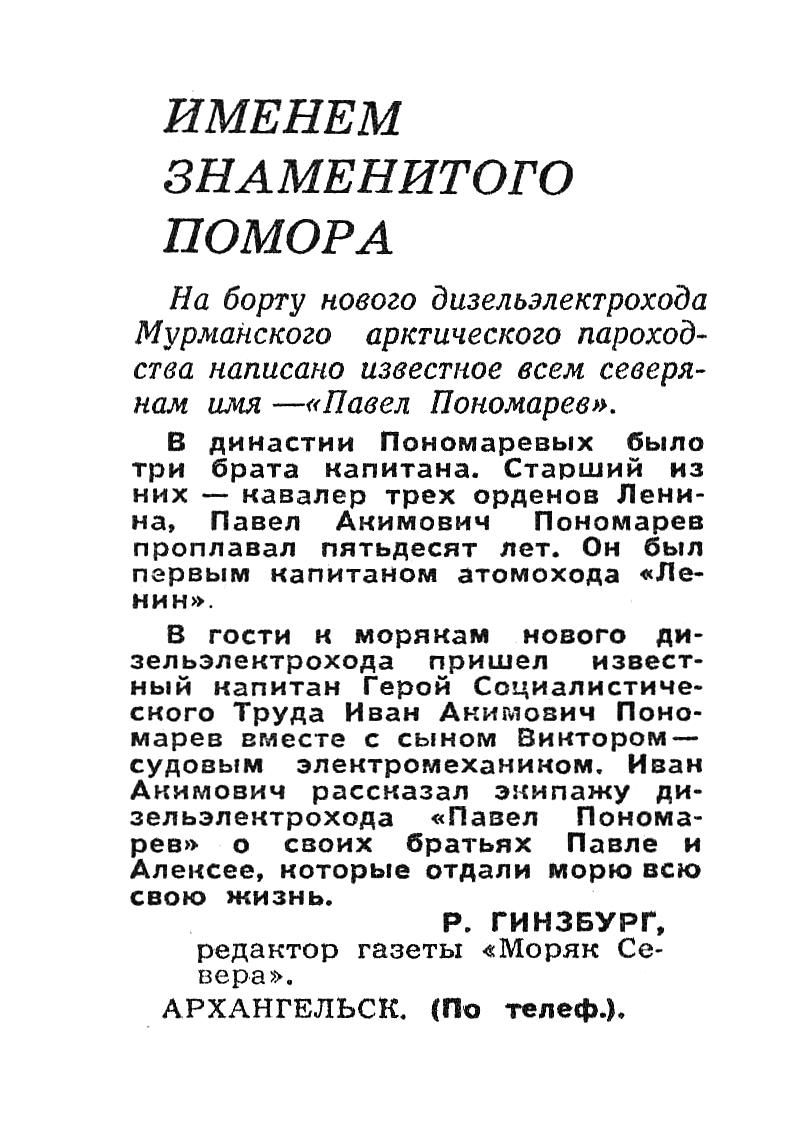 В гости к морякам нового дизельэлектрохода пришел известный капитан Герой Социалистического Труда Иван Акимович Пономарев вместе с сыном Виктором — судовым электромехаником. Иван Акимович рассказал экипажу дизельэлектрохода «Павел Пономарев» о своих братьях Павле и Алексее, которые отдали морю всю свою жизнь.