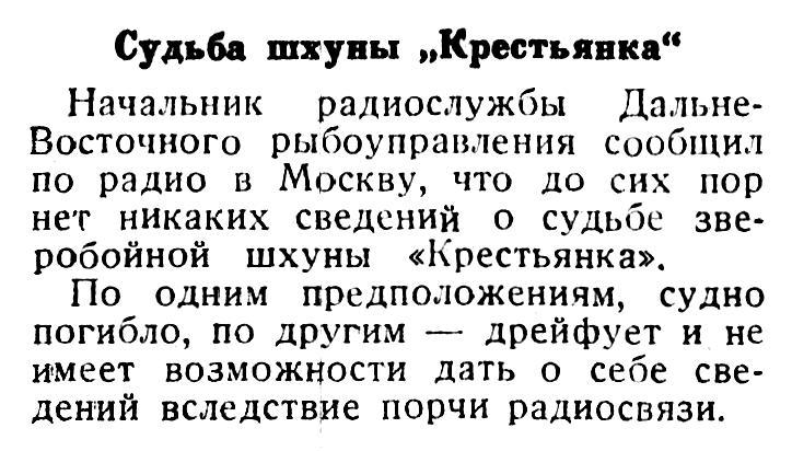 Начальник радиослужбы Дальневосточного рыбоуправления сообщил по радио в Москву, что до сих пор нет никаких сведений о судьбе зверобойной шхуны «Крестьянка».