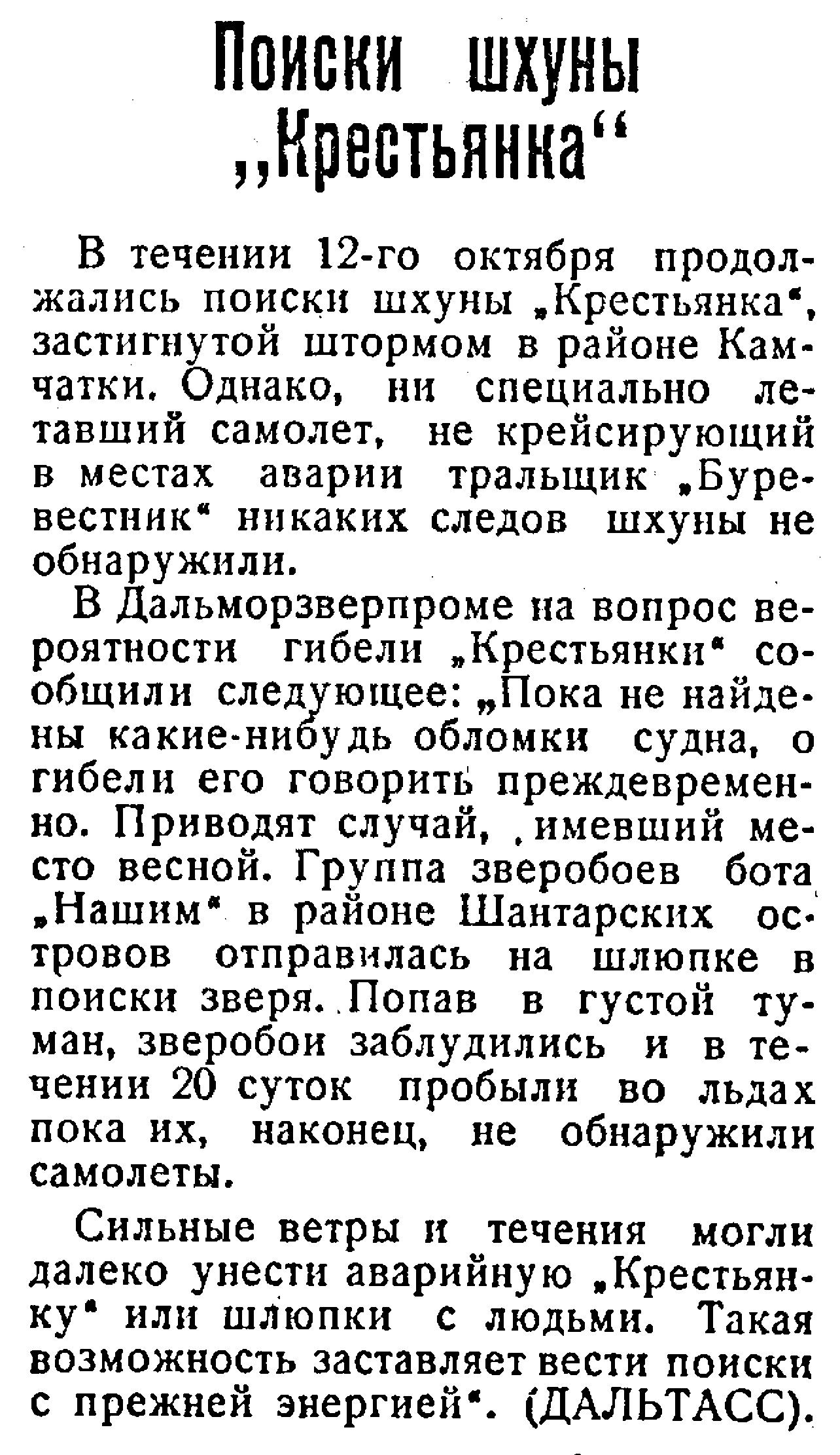 ХАБАРОВСК, 8 (ДАЛЬТАСС). 5 и 6 октября в районе Камчатки пронесся огромной силы шторм, которым была застигнута зверобойная шхуна «Крестьянка», вышедшая 2 октября из Петропавловска. Во время шторма многими рациями был принят сигнал о бедствии. «Крестьянка» сообщила, что неправильно распределенный в трюмах груз при шторме вызвал сильный крен. Судно потеряло управление. На помощь немедленно вышли пароходы «Бурят» и «Восток». Через несколько часов радист «Крестьянки» повторил свои координаты и сообщил: «Затопляет радиобудку, прекращаю работу». Пароходы, посланные на помощь, до сих пор не обнаружили шхуну. На шхуне 22 человека команды и 1 пассажир.