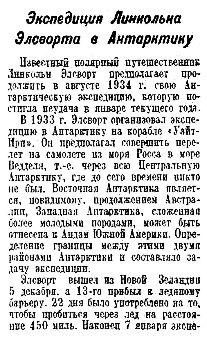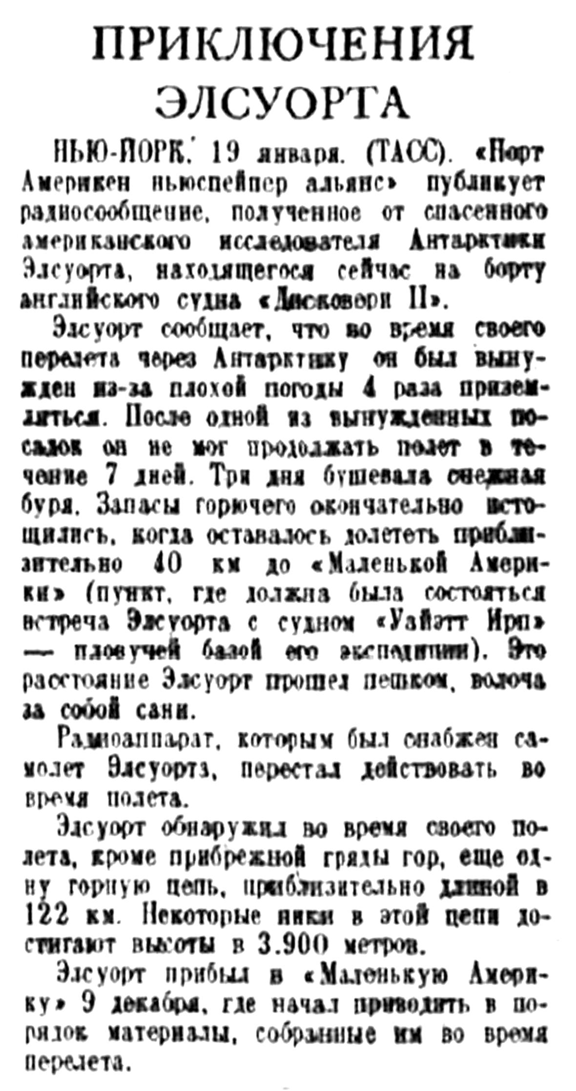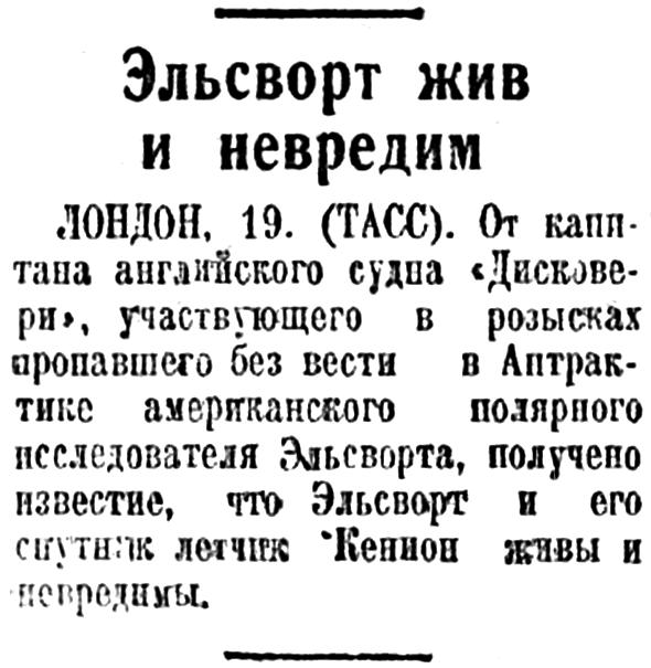 21 ноября 1935 года Элсворт вылетел с острова Денди через Южный полюс, и с тех пор о нем нет никаких известий. Он и летчик Кенион пропали без вести. Судя по газетам, английскому судну «Дисковери» предписано предпринять розыски двух мужественных исследователей.