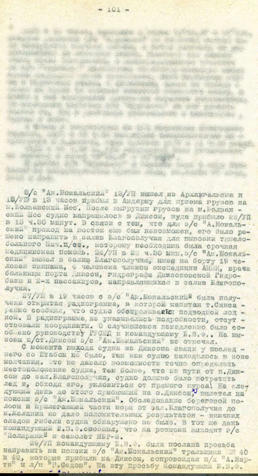 Когда мы подошли [карандашом: «были сняты 3 группы, всего 15 чел.»] поиски были уже кончены и капитан торопил [карандашом: «не рискуя подвергнуться нападению подлодки»], решил идти в зал.Благополучия. Здесь на мыске показался огонек. Подошли – оказался Васильев. Буфетчицу он оставил между 3-м и 4-м ледником. Его сняли. Когда он обогрелся, то заявил, что хочет идти на катере искать буфетчицу и ушел. Остальные двое – очень далеко и капитан не рискнул идти их искать.