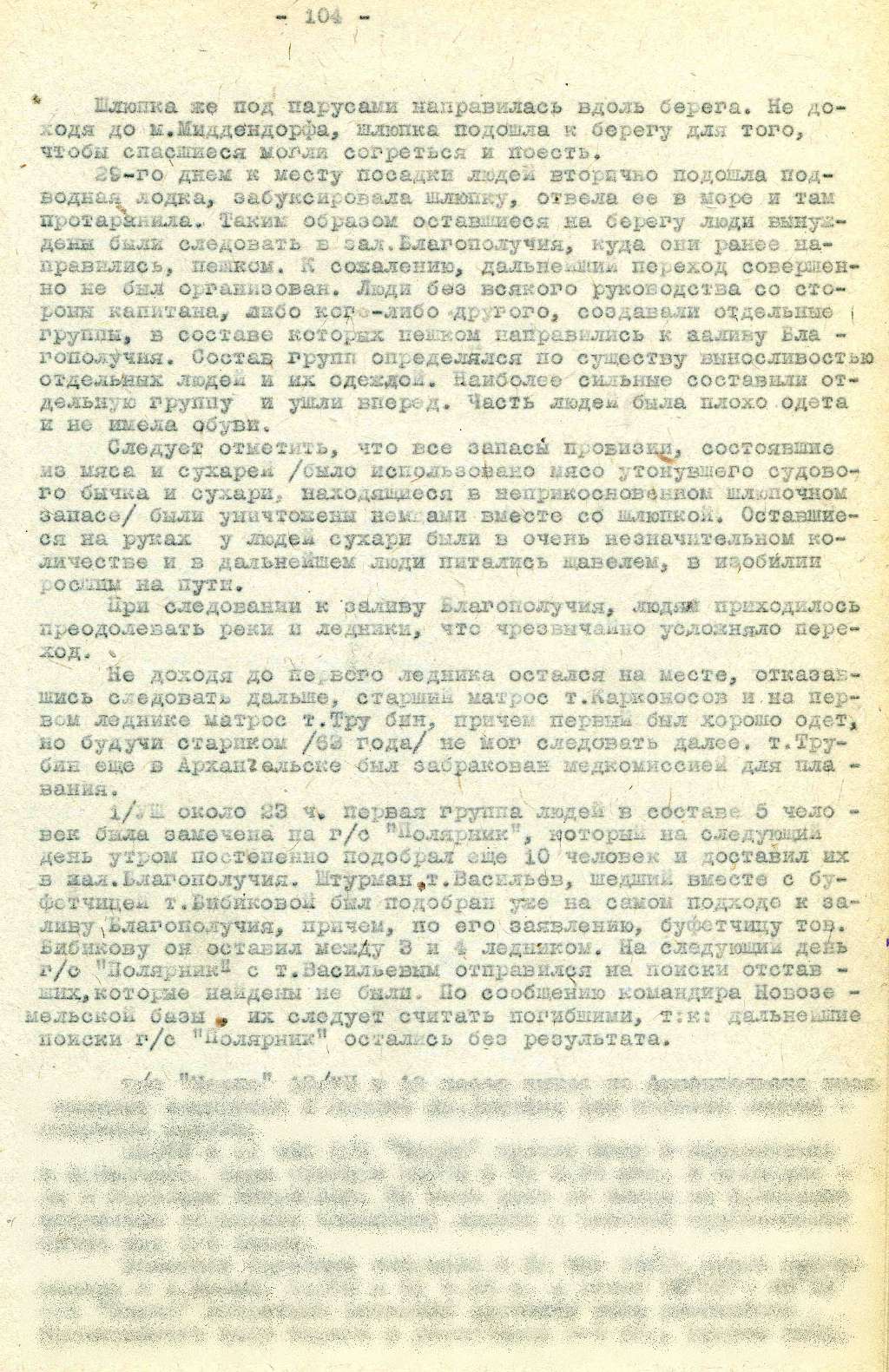 В начале он был руководителем нашей группы, но потом он сразу нас бросил, перешел вброд реку и скрылся от нас. (В оригинале данное предложение особо подчеркнуто красным карандашом). Об организации групп я ничего не знал, т.к. организующей роли ни у кого не было видно. Большаков сам бежал впереди всех и не мог называться руководителем. (В оригинале данное предложение особо подчеркнуто красным карандашом). Женщин он бросил. Меня поддерживал 2-й механик Бик. Катаргина настаивала, чтобы ее оставили в пути. Вели ее под руки, обмотали ей ноги чем могли, поддерживали по возможности физически – перетаскивали через речку, но не бросали. Все ноги у нее были в крови и дальше второго ледника она не смогла бы пройти. Недостаток, конечно, был и в том, что все разбрелись – слабые и сильные сразу выявились. Что-нибудь сказать об организации на судне («Ак.Шокальский») ничего не могу, т.к. сам на судне (приписано сверху карандашом) находился всего лишь 2 суток до во время (приписано сверху карандашом) плавания.