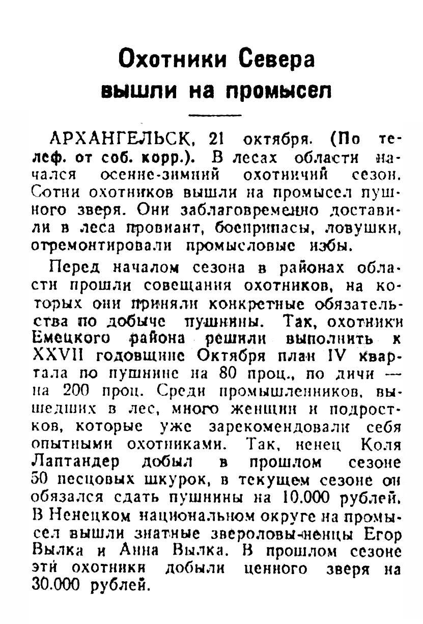 Появление возчиков на фактории — целое событие. Они привозят новости, письма, сразу за месяц-два газеты, обеспечивают на весь год охотников продовольствием, порохом и дробью. В обратный путь олений транспорт раньше отправлялся налегке, захватив пушнину. В этом году впервые потребкооперацией организована вывозка из самых глубинных мест не только пушнины, но и собранных здесь за лето ягод и грибов, а также рыбы и мяса.