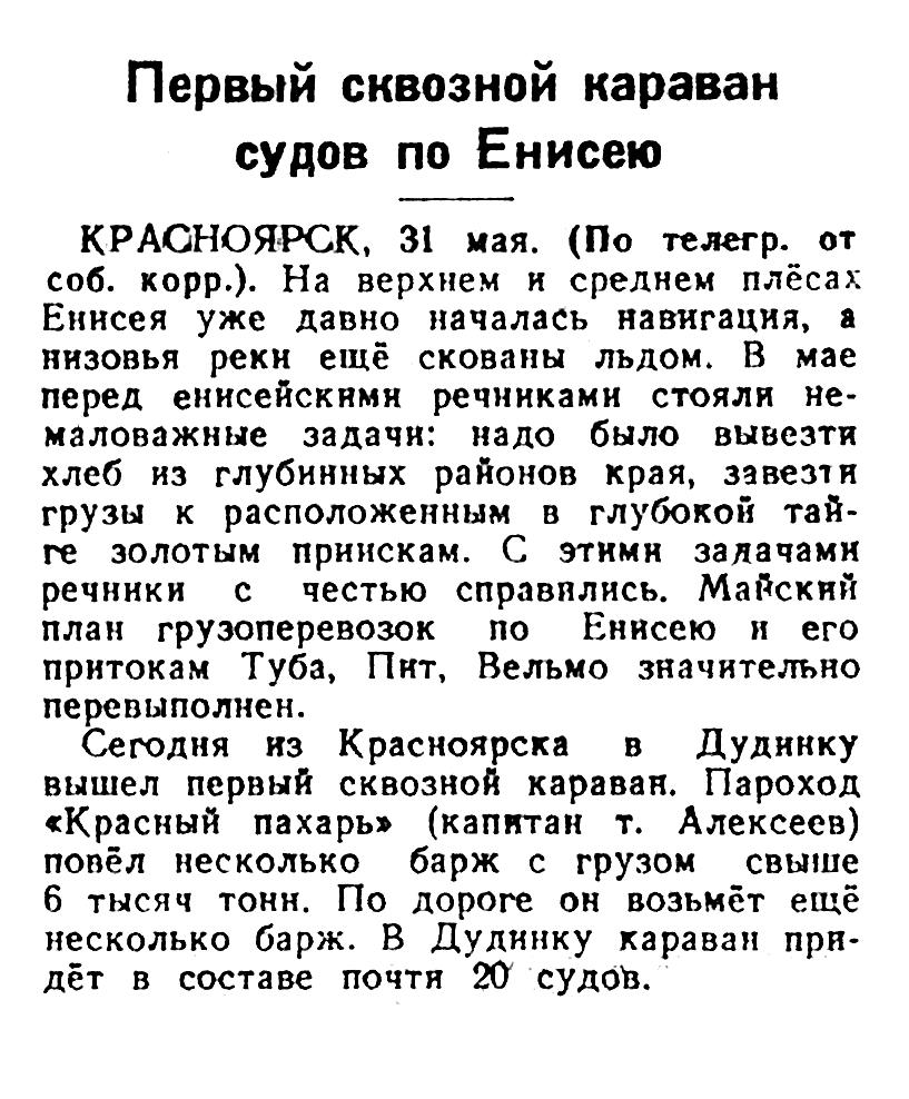 Сегодня из Красноярска в Дудинку вышел первый сквозной караван. Пароход «Красный пахарь» (капитан т. Алексеев) повёл несколько барж с грузом свыше 6 тысяч тонн. По дороге он возьмёт ещё несколько барж. В Дуднику караван придёт в составе почти 20 судов.