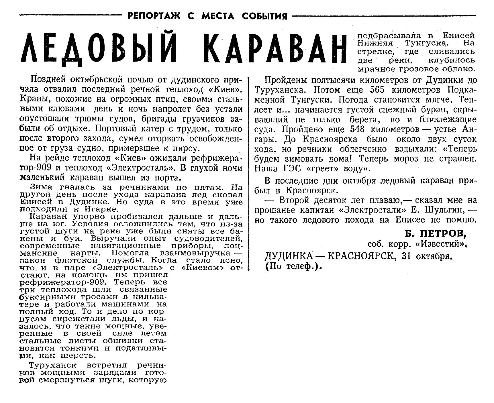 Караван упорно пробивался дальше и дальше на юг. Условия осложнились тем, что из-за густой шуги на реке уже были сняты все бакены и буи. Выручали опыт судоводителей, современные навигационные приборы, лоцманские карты. Помогла взаимовыручка — закон флотской службы. Когда стало ясно, что и в паре «Электросталь» с «Киевом» отстают, на помощь им пришел рефрижератор-909. Теперь все три теплохода шли связанные буксирными тросами в кильватере и работали машинами на полный ход. То и дело по корпусам скрежетали льды, и казалось, что такие мощные, уверенные в своей силе летом стальные листы обшивки становятся тонкими и податливыми, как шерсть. Туруханск встретил речников мощными зарядами готовой смерзнуться шуги, которую подбрасывала в Енисей Нижняя Тунгуска. На стрелке, где сливались две реки, клубилось мрачное грозовое облако. Пройдены полтысячи километров от Дудинки до Туруханска. Потом еще 565 километров Подкаменной Тунгуски. Погода становится мягче. Теплеет и... начинается густой снежный буран, скрывающий не только берега, но и близлежащие суда. Пройдено еще 548 километров — устье Ангары. До Красноярска было около двух суток хода, но речники облегченно вздыхали: «Теперь будем зимовать дома! Теперь мороз не страшен. Наша ГЭС «греет» воду». В последние дни октября ледовый караван прибыл в Красноярск.