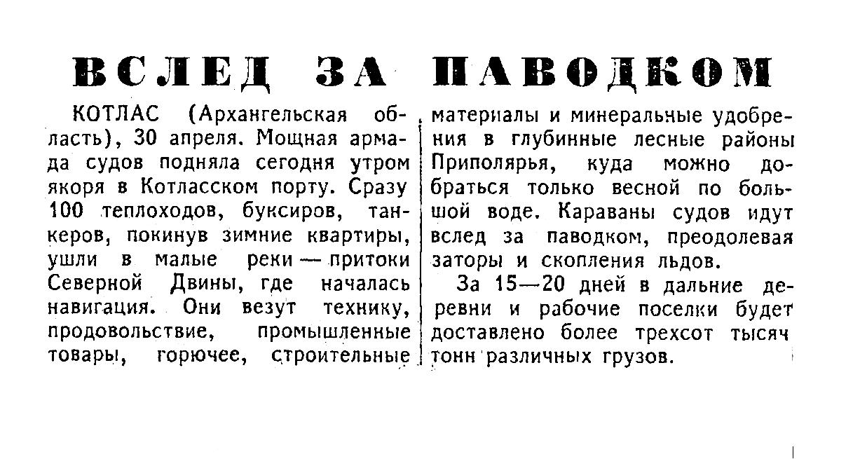 КОТЛАС (Архангельская область), 30 апреля. Мощная армада судов подняла сегодня утром якоря в Котласском порту. Сразу 100 теплоходов, буксиров, танкеров, покинув зимние квартиры, ушли в малые реки — притоки Северной Двины, где началась навигация. Они везут технику, продовольствие, промышленные товары, горючее, строительные материалы и минеральные удобрения в глубинные лесные районы Приполярья, куда можно добраться только весной по большой воде. Караваны судов идут вслед за паводком, преодолевая заторы и скопления льдов. За 15—20 дней в дальние деревни и рабочие поселки будет доставлено более трехсот тысяч тонн различных грузов.