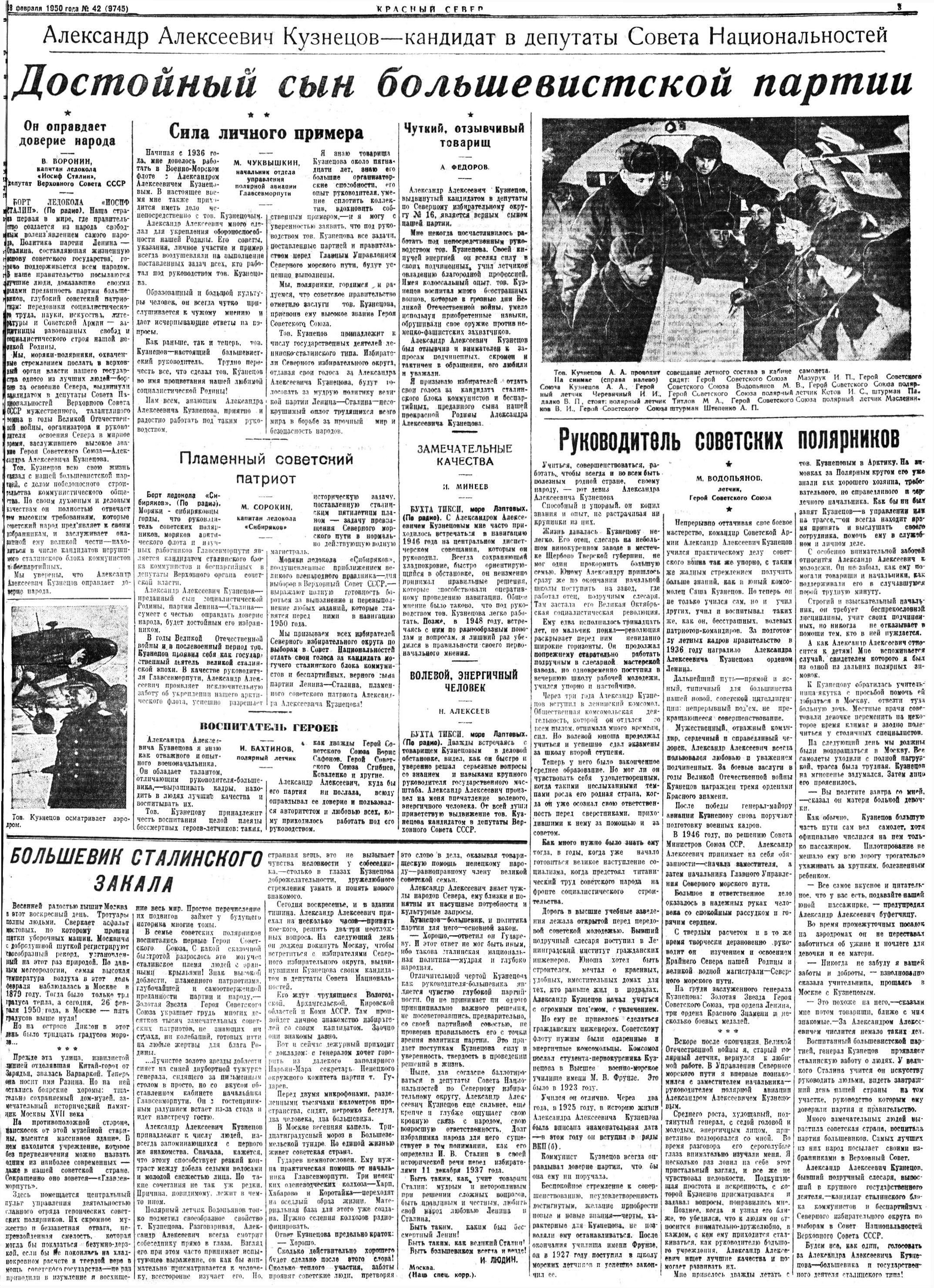Кузнецов Александр Алексеевич [10(23).2.1904, с. Щербово, ныне Торжокского р-на Тверской обл. — 7.8.1966, Москва]. Русский; генерал-лейтенант авиации (27.1.1951); Герой Сов. Союза (6.12.1949); в ВМФ с 1923; член компартии с 1925. Окончил Военно-мор. подготовит, уч-ще (10.1923-9.1924), Военно-мор. уч-ще им. М. В. Фрунзе (9.1924-5.1927), школу мор. летчиков и летнабов ВВС РККА им. Сталина в Ейске (10.1927-2.1929; 6.1931-2.1933), КУВНАС при Военно-мор. акад. им. К. Е. Ворошилова (12.1940-5.1941).