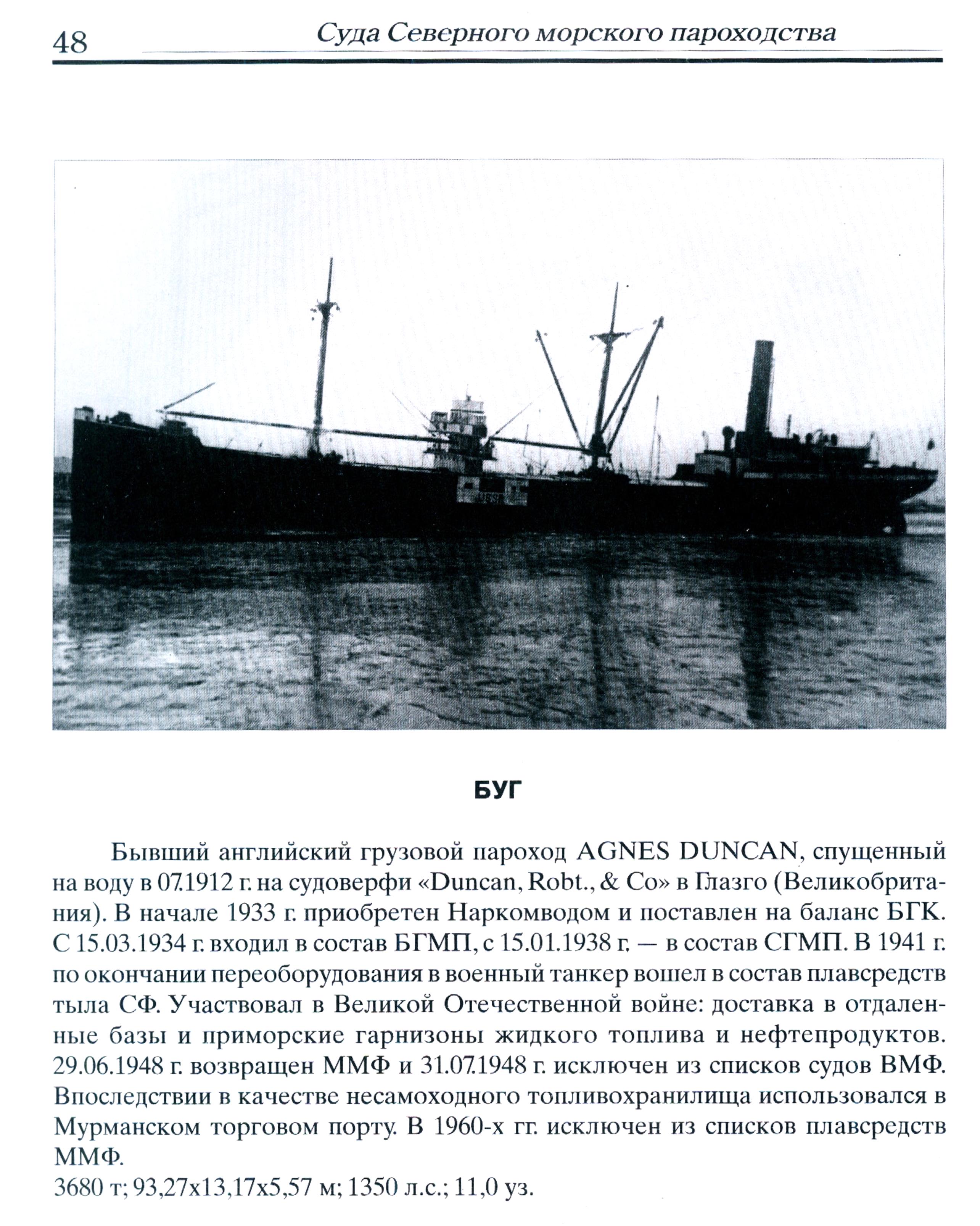 Бывший английский грузовой пароход AGNES DUNCAN, спущенный на воду в 071912 г. на судоверфи «Duncan, Robt., & Со» в Глазго (Великобритания). В начале 1933 г. приобретен Наркомводом и поставлен на баланс БГК. С 15.03.1934 г. входил в состав БГМП, с 15.01.1938 г. — в состав СГМП. В 1941 г. по окончании переоборудования в военный танкер вошел в состав плавсредств тыла СФ. Участвовал в Великой Отечественной войне: доставка в отдаленные базы и приморские гарнизоны жидкого топлива и нефтепродуктов. 29. 06. 1948 г. возвращен ММФ и 31.07.1948 г. исключен из списков судов ВМФ. Впоследствии в качестве несамоходного топливохранилища использовался в Мурманском торговом порту. В 1960-х гг. исключен из списков плавсредств ММФ.